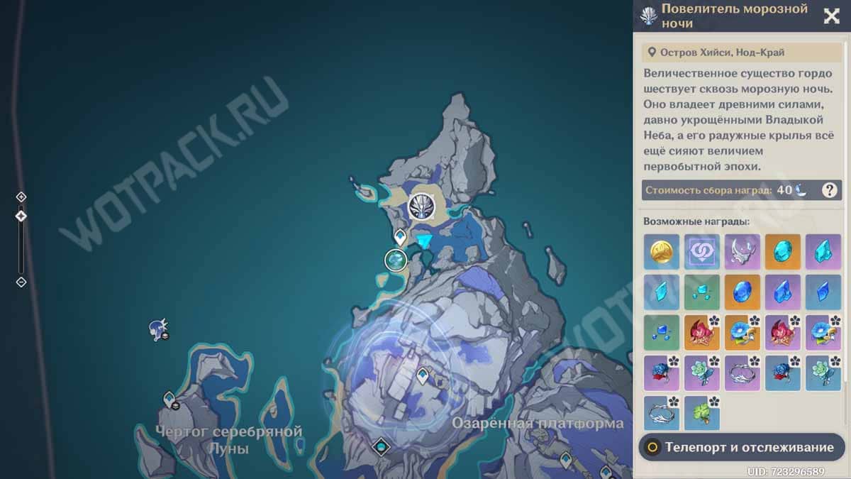 Повелитель морозной ночи находится на территории Нод-Края, на севере острова Хийси. Переместитесь к телепорту над Озаренной платформой и пройдите на арену к лунному коню. Ориентиром может послужить появившийся полумесяц, из которого появится скакун.