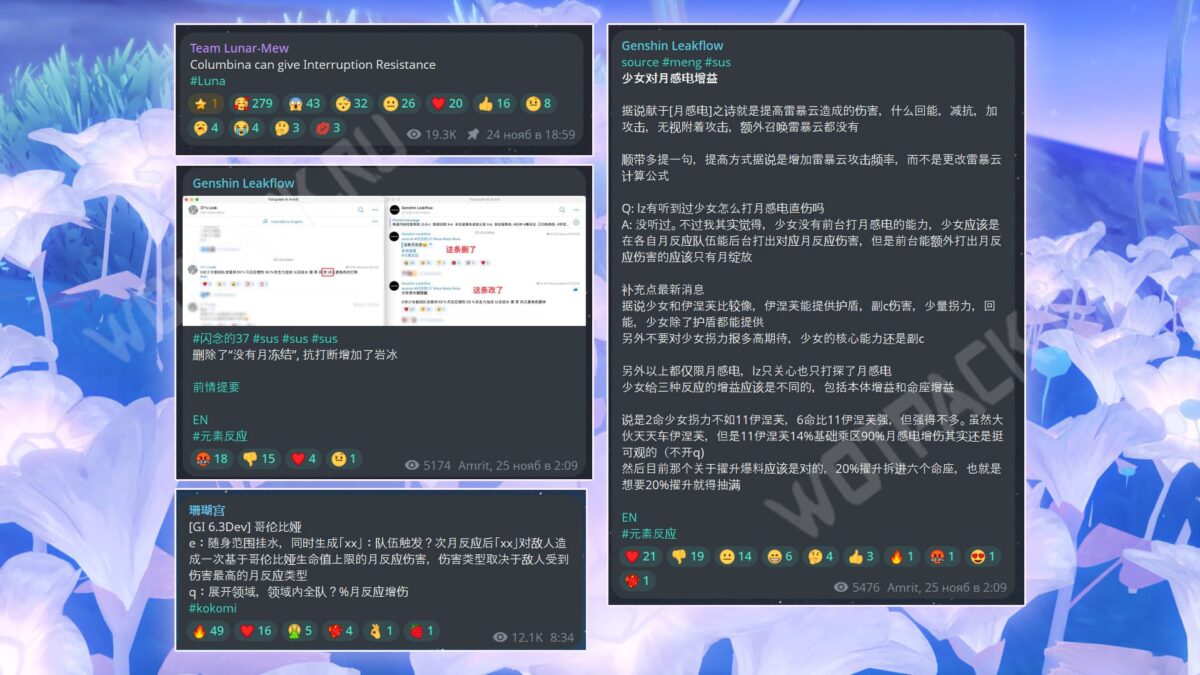 Месяц назад 闪念的37 писал, что Предвестница усиливает урон Лунных реакций, силу атаки и даёт сопротивление к прерыванию некоторых стихий. Leakflow заметил то, что он отредактировал своё сообщение. Теперь в нём упомянуто сопротивление для Гидро, Электро, Дендро, Анемо, Гео и Крио (всё, за исключением Пиро).