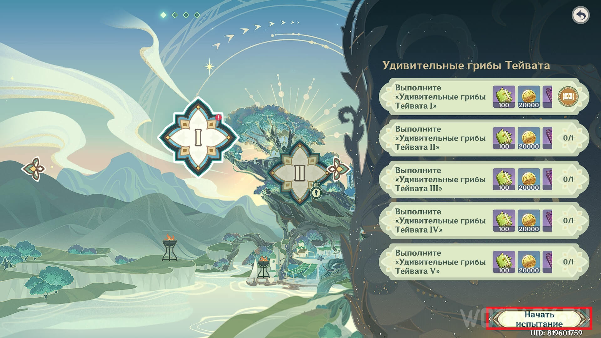 Откройте вкладку с событием и приступите к первой части. Нажмите на кнопку «Начать испытание» в правом нижнем углу, чтобы отслеживать точное расположение каждого этапа. Возьмите Дендро персонажа в отряд и накладывайте с его помощью соответсвующий статус на врагов для активации стихийных взаимодействий — это позволит наносить повышенный урон и быстрее завершить уровни.