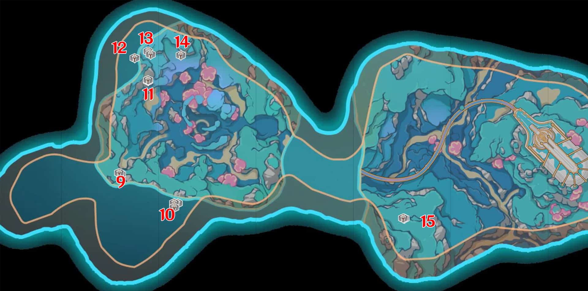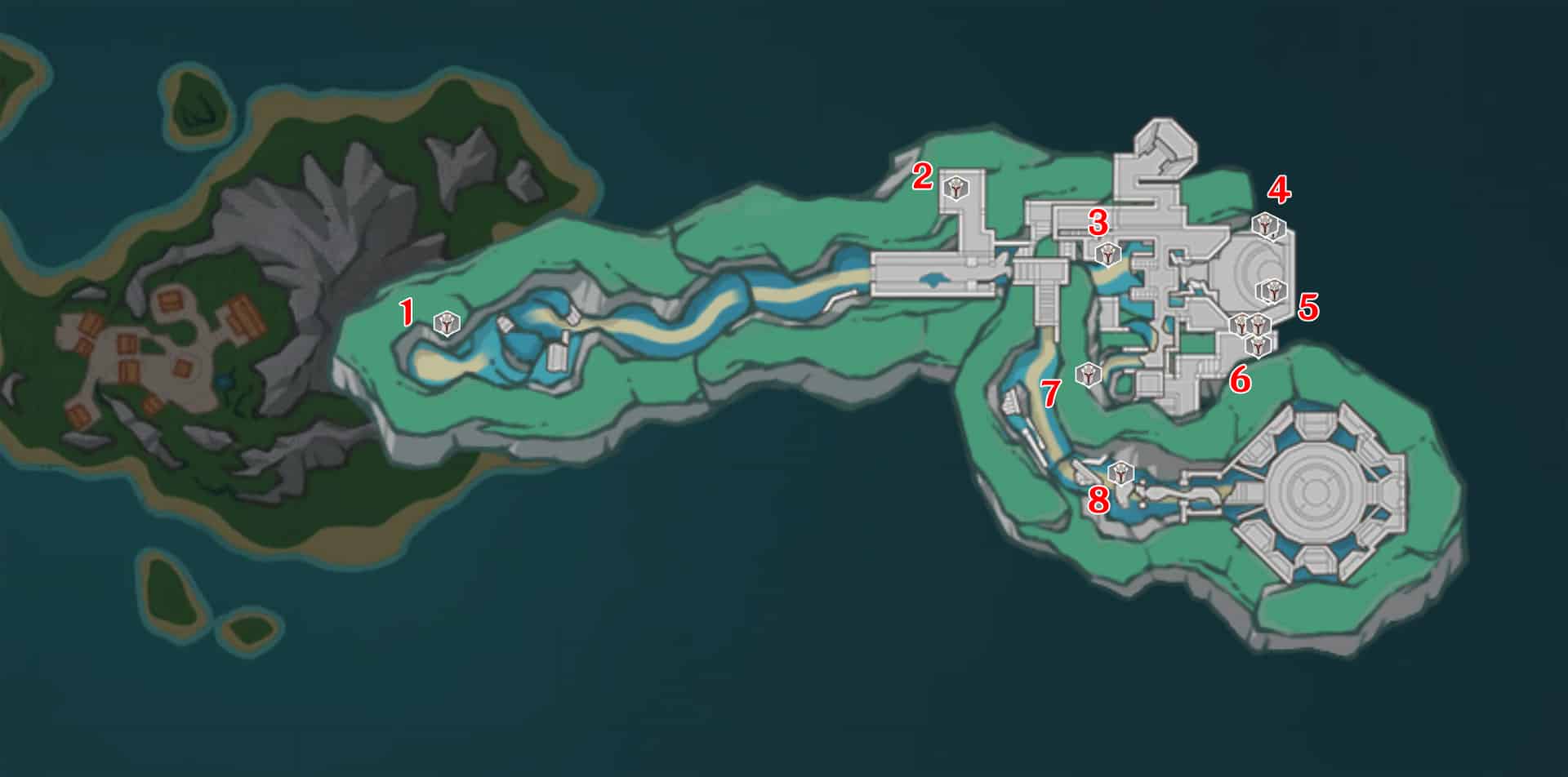 Телепортируйтесь во вторую часть Моря древности и посетите Двор гармонии. 2 статуи расположены в нижней части пещеры около небольшого водопада.