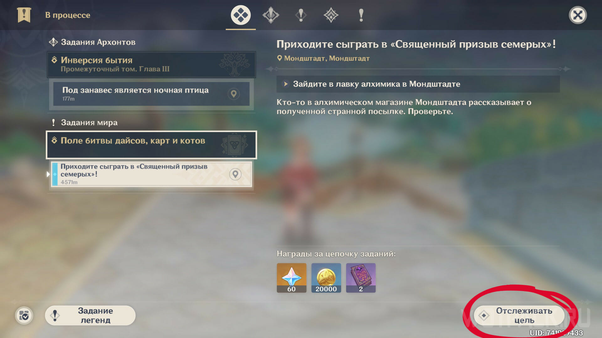 После их выполнения в журнале заданий начнется первый обучающий квест «Приходите сыграть в Священный призыв семерых!». Для удобства можно начать отслеживание миссии, нажав на соответствующую кнопку в правом нижнем углу экрана.