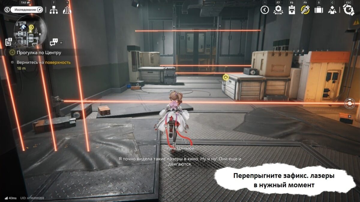 - Во втором — перепрыгните горизонтальный луч и подойдите к противоположной стене комнаты. Затем, дождавшись, когда движимая линия поедет к потолку, перепрыгните два зафиксированных лазера.