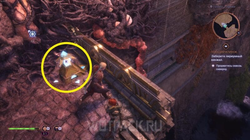 Вторая цель находится под магическим мостом, создаваемым эльфийским механизмом. Сгусток тоже растет на стене и его нужно нейтрализовать дальнобойным навыком, но чтобы взять его в прицел, сделайте следующее: