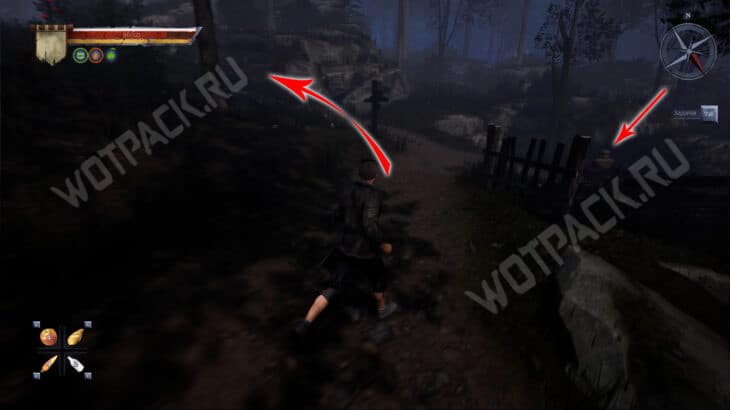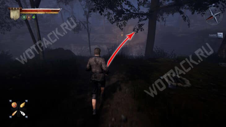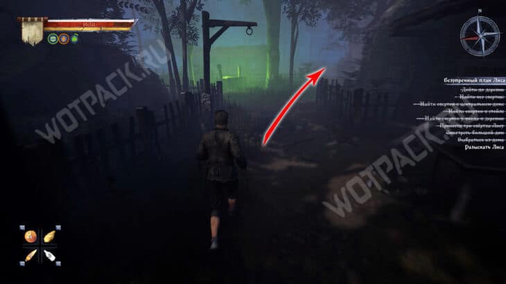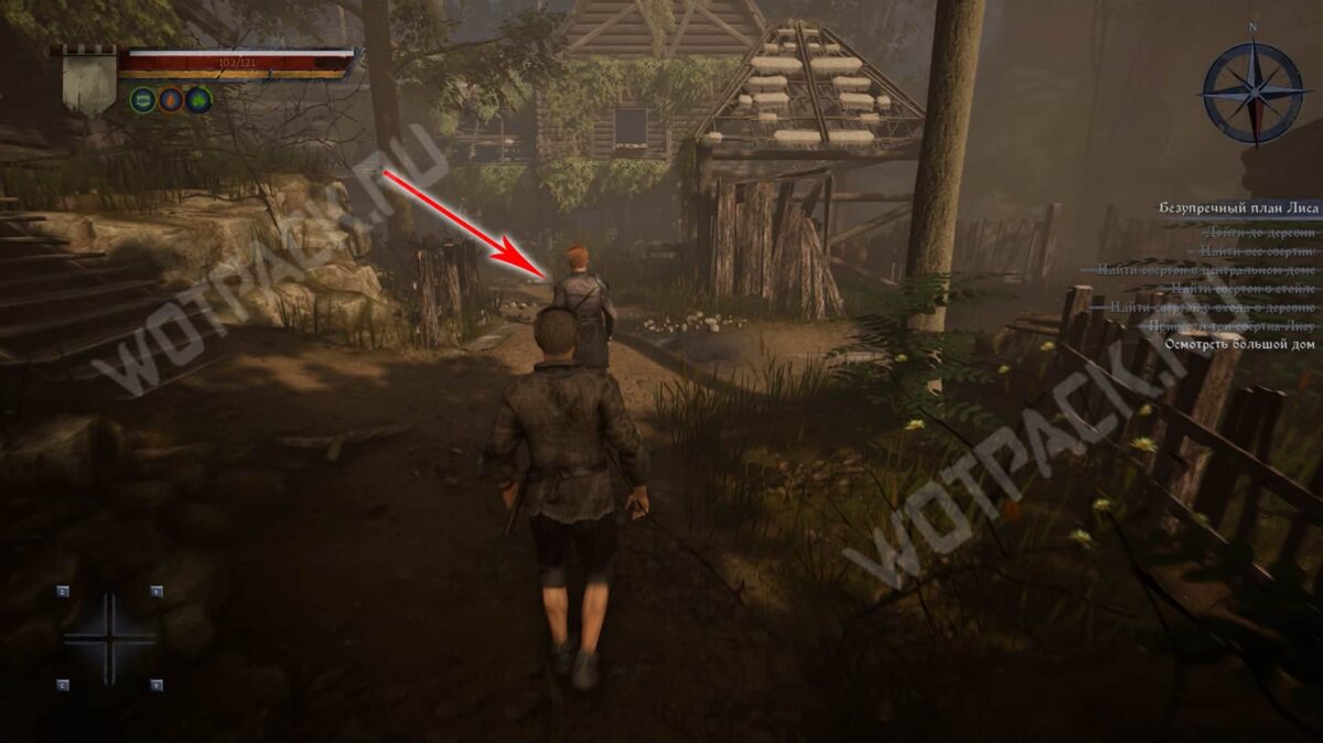 От большого дома поверните направо и двигайтесь по восточной тропе. Ориентируйтесь на колодец с зеленым светом — он быть по левую сторону от дорожки. Покиньте деревню и перейдите реку по деревянному мосту.