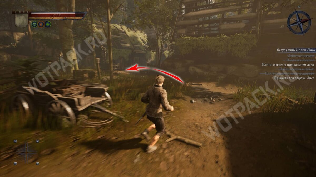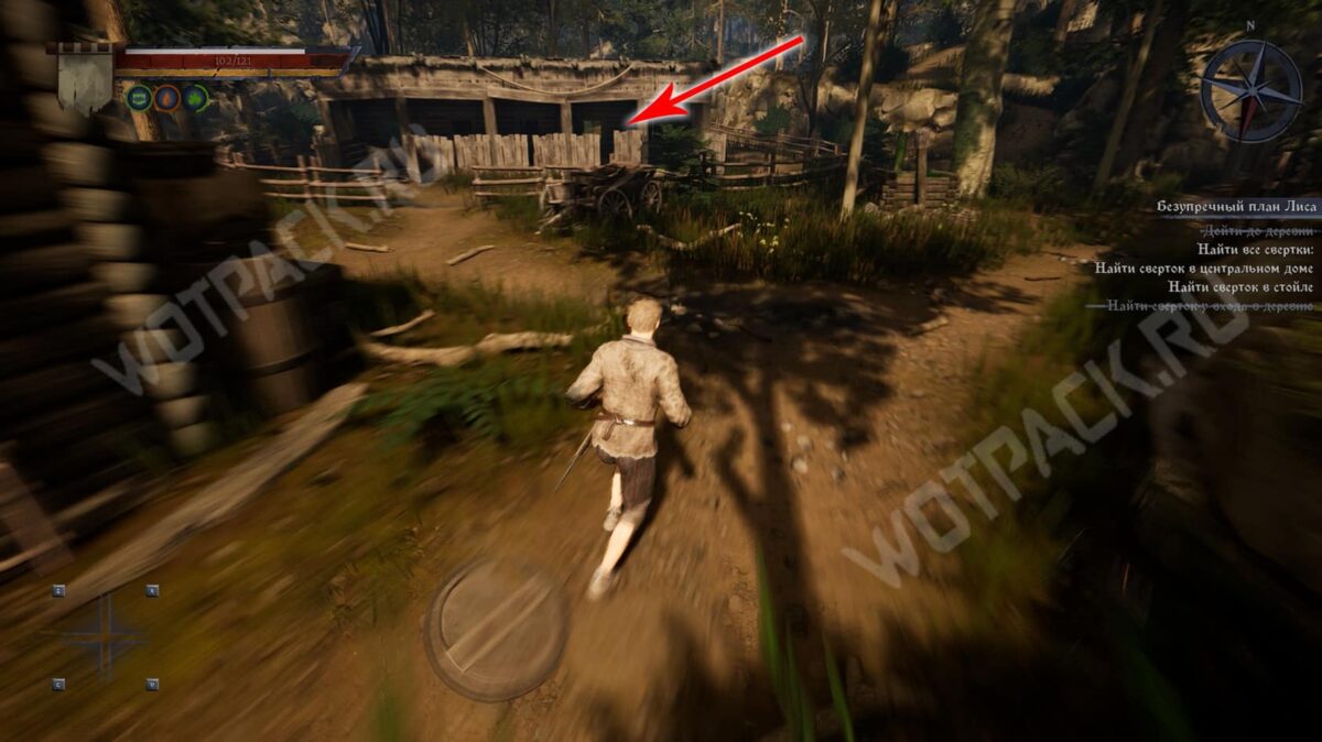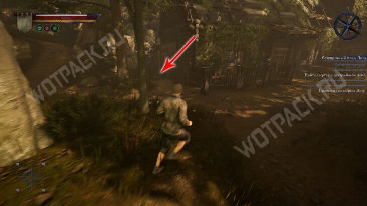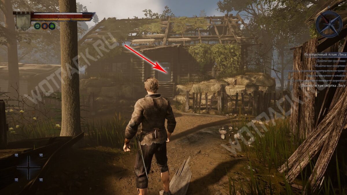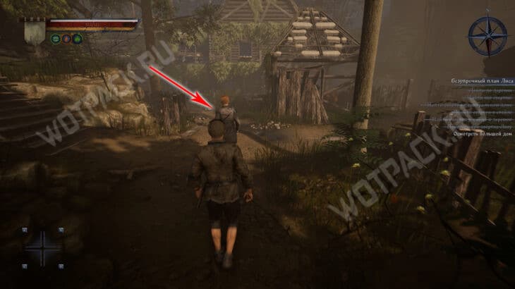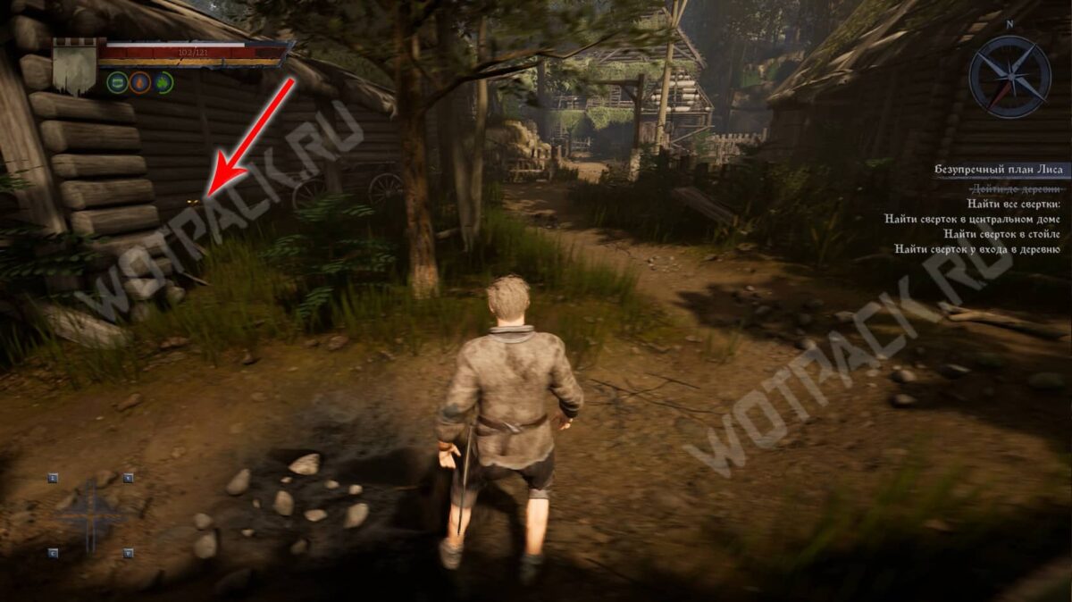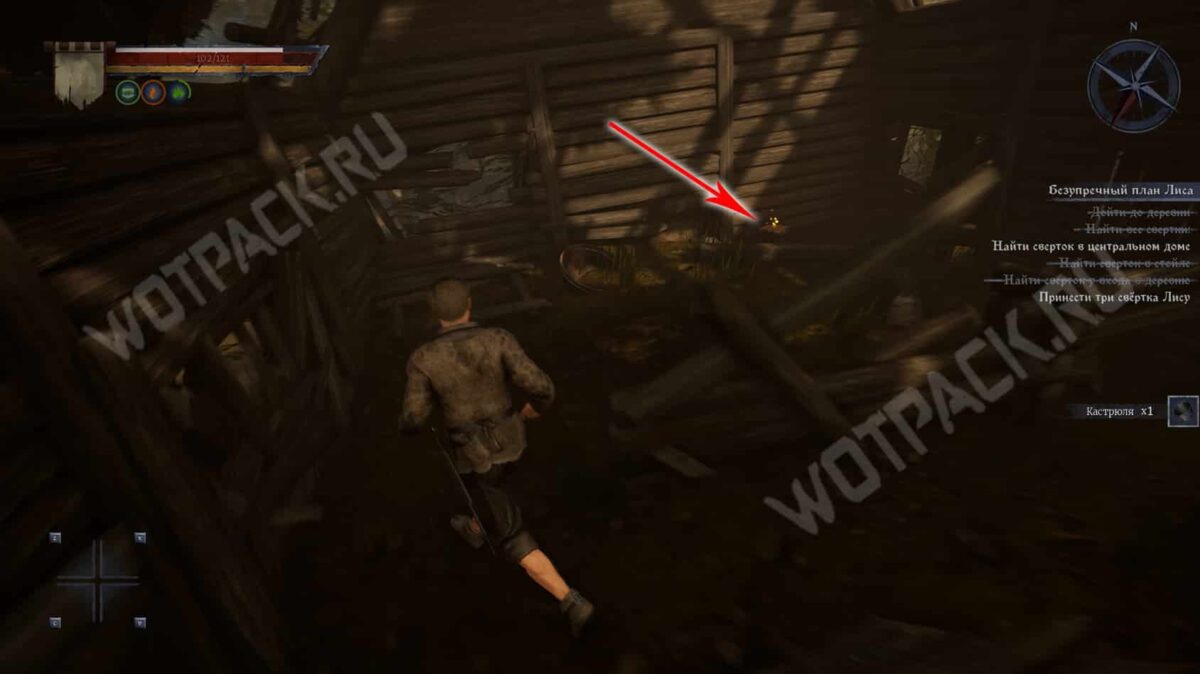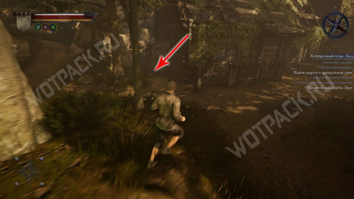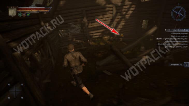 - Затем следуйте прямо по тропе, пока не упретесь в деревянный забор. От него поверните направо и загляните в центральный дом с правой стороны. В углу за поваленными деревяшками лежит сверток.