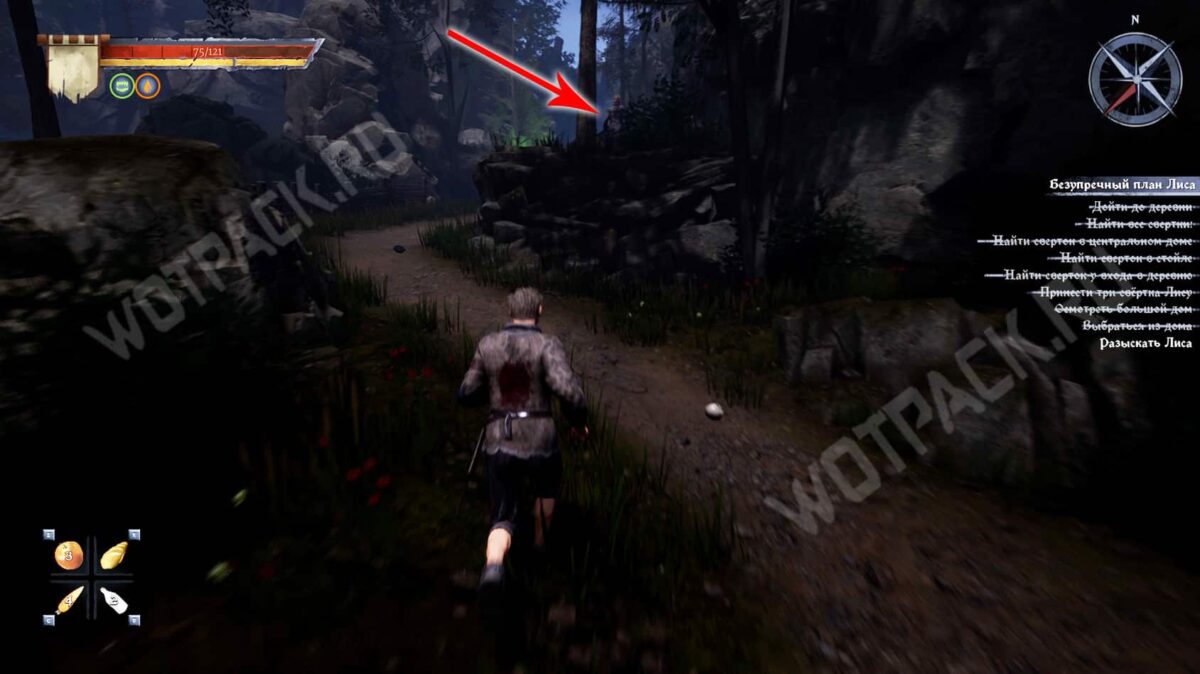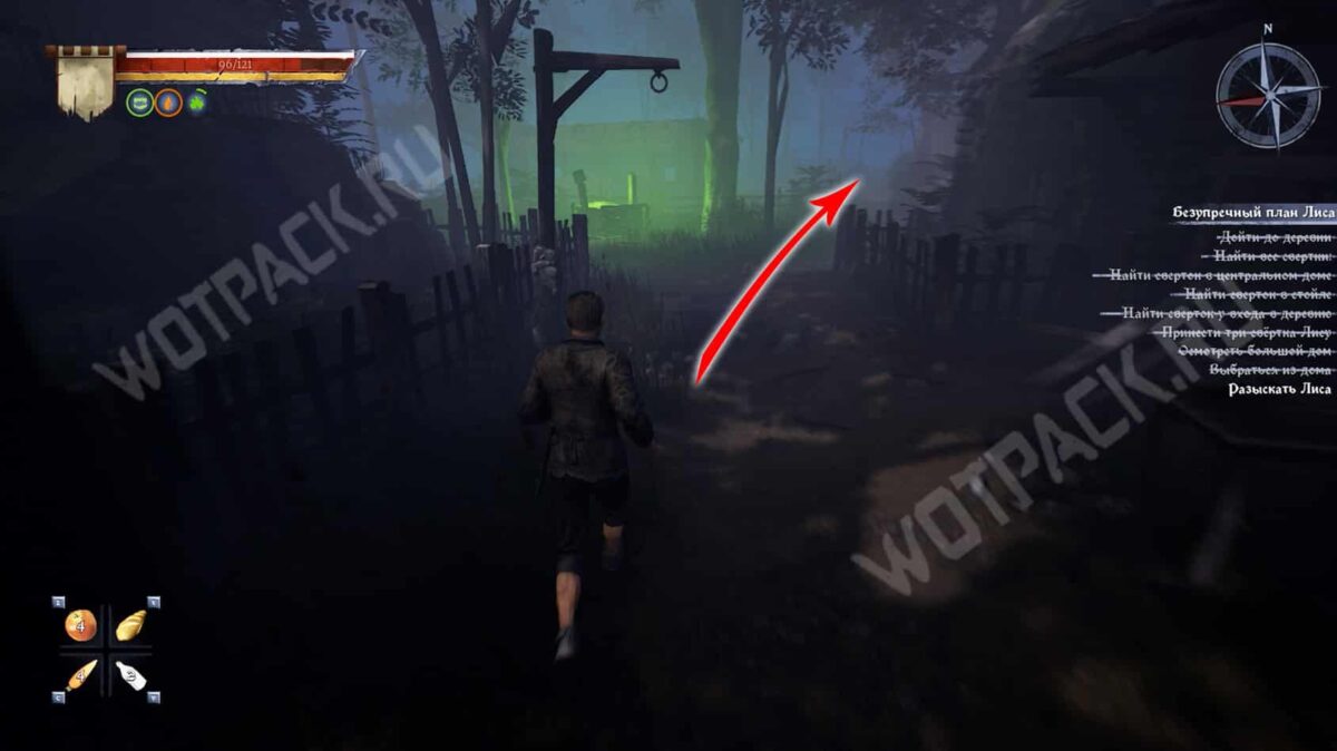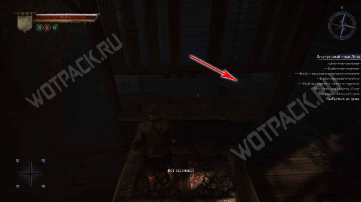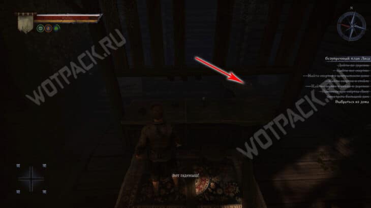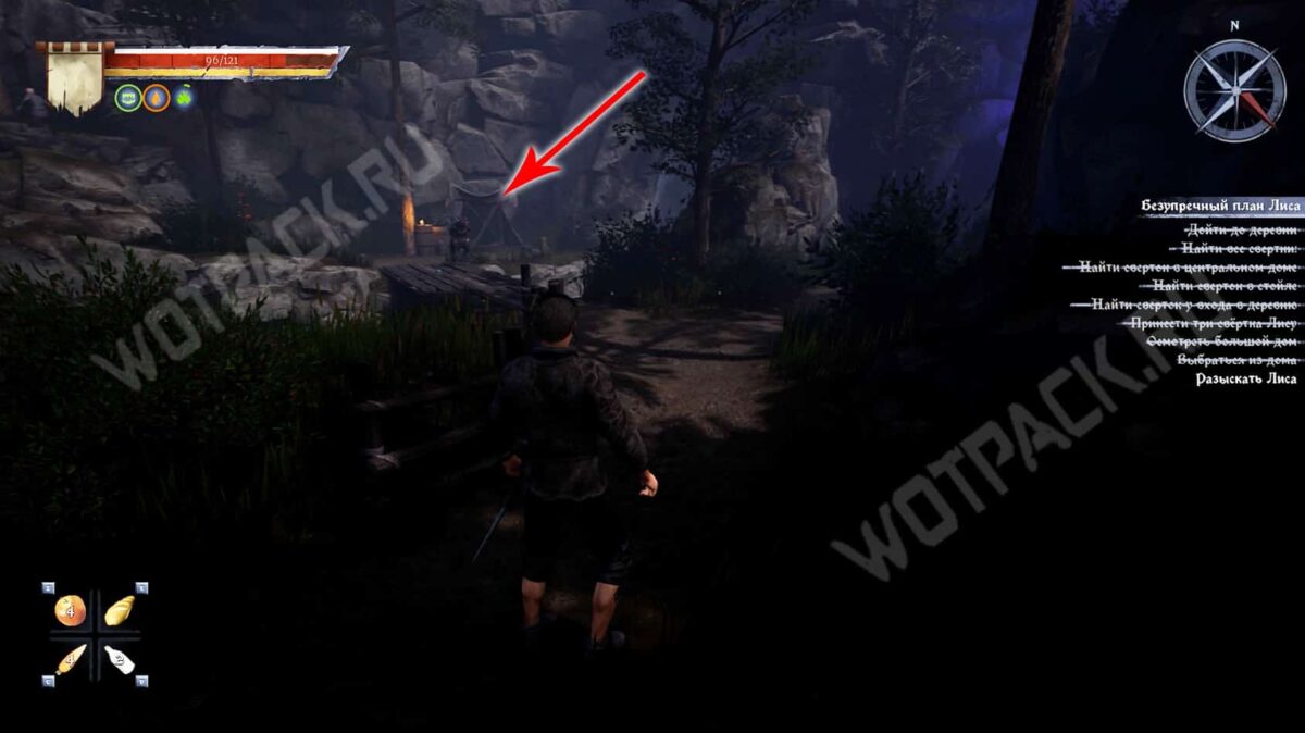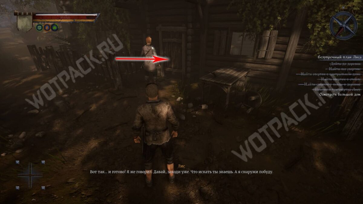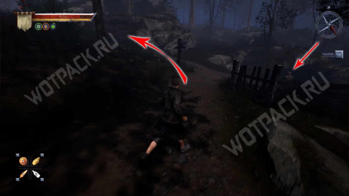 - Затем следуйте прямо по тропе, пока не упретесь в деревянный забор. От него поверните направо и загляните в центральный дом с правой стороны. В углу за поваленными деревяшками лежит сверток.