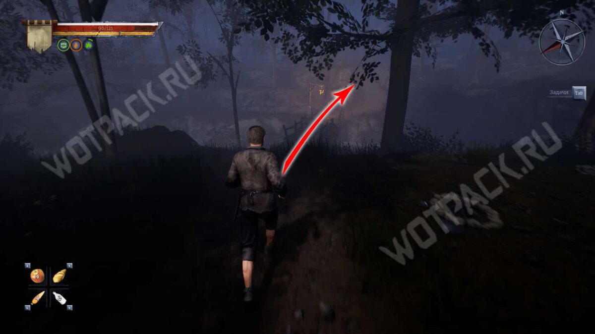 - Сверните на правую тропу от Лиса, затем сразу налево и пройдите мимо хранилища с сеном — за ним расположено стойло. Зайдите в первый справа загон, перескочите через ограждение и подберите мешочек.