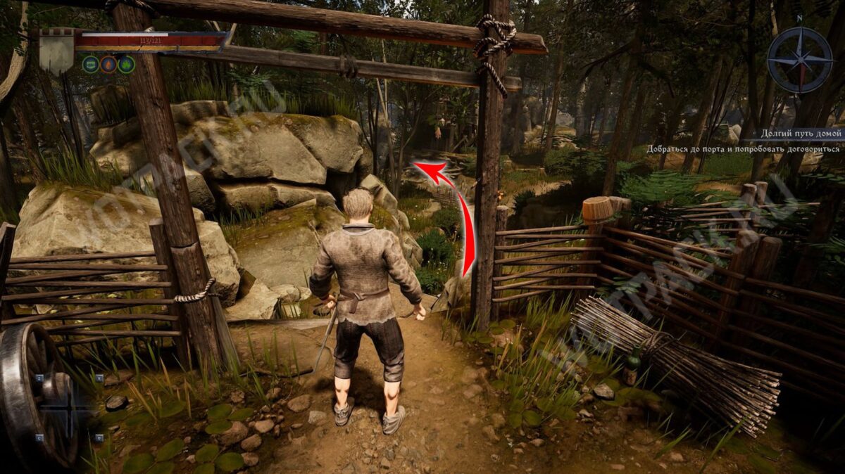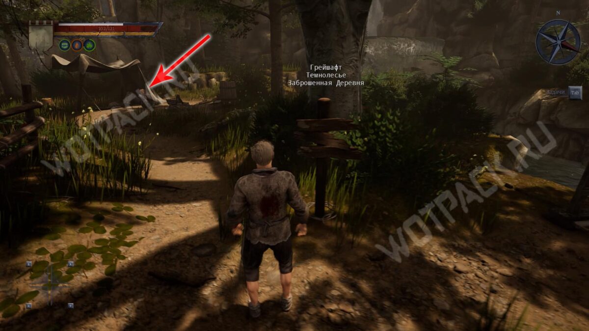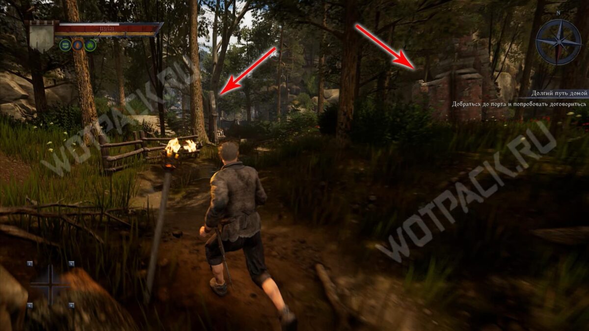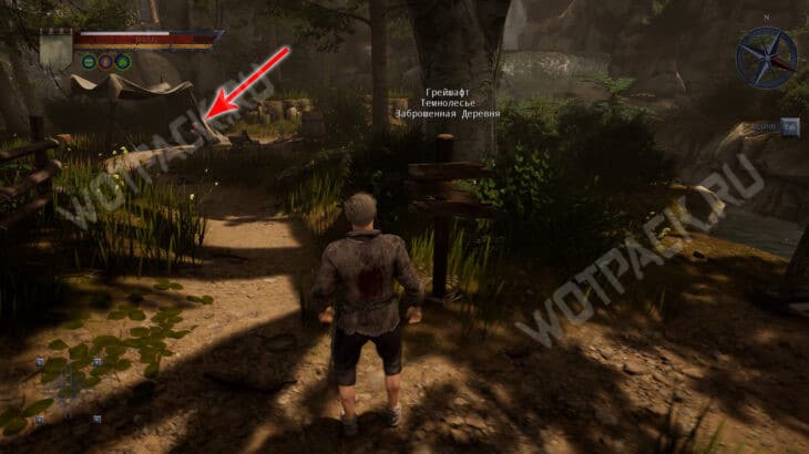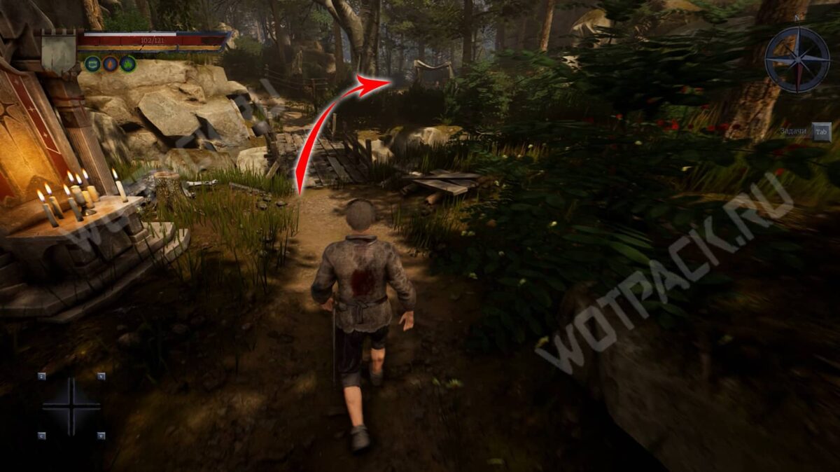 Покинув жилище старика Нереста, следуйте прямо по южной тропе мимо разрушенной деревянной постройки с ветхим плетеным забором. Не сходите с дорожки, если не готовы к бою, так как в лесу водятся зеленые жуки. У руин каменной крепости заметите алтарь, при желании у него можно помолиться или получить благословение за монеты. Рядом с ним также может появиться молодой волк пятого уровня.