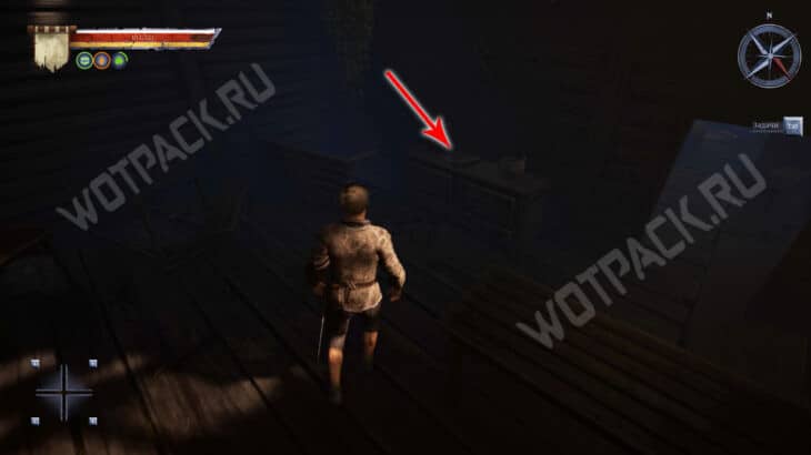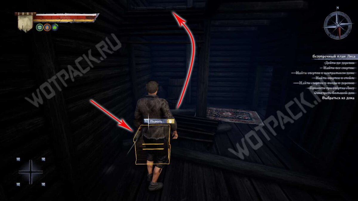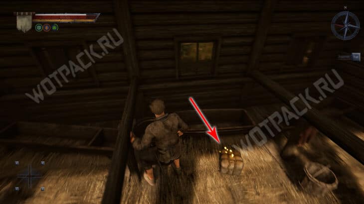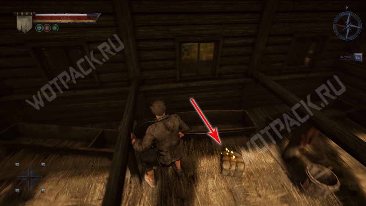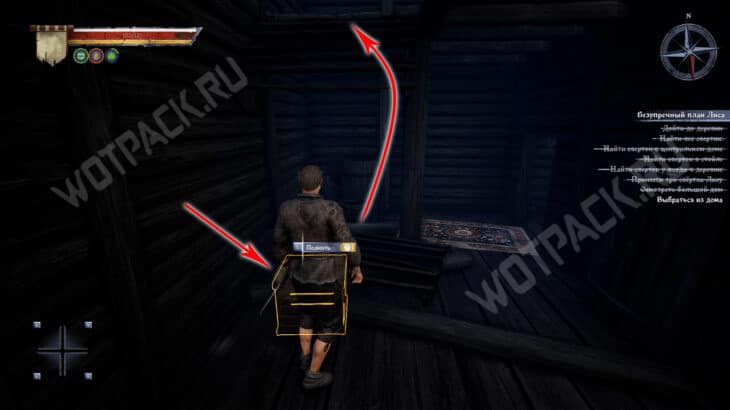 Двигайтесь к коридору и в правой комнате проверьте мешок с желтыми огнями, внутри найдете Записку из корчмы. Обернитесь, поднимите деревянный блок и перетащите его под сломанную лестницу. Встаньте на него и зацепитесь за оставшиеся ступеньки, чтобы вскарабкаться на второй этаж.