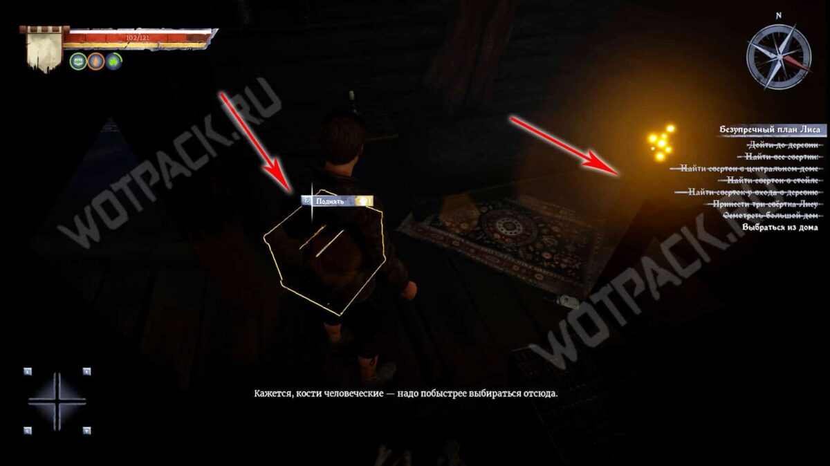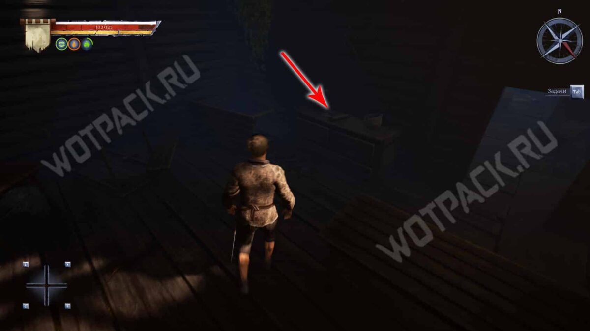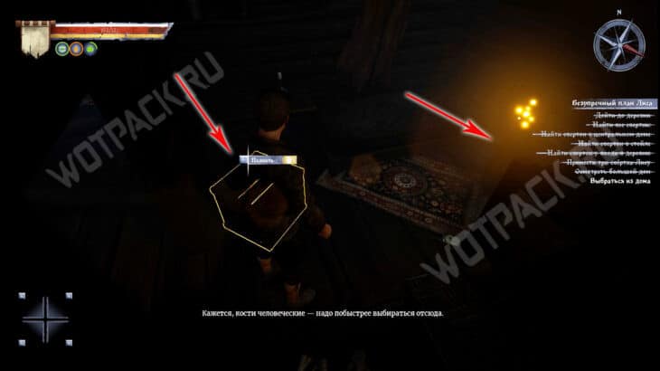 Осмотритесь вокруг и соберите лежащие предметы во всех комнатах большого дома. В главном зале на тумбочке справа возьмите Набор для заточки оружия, а на барной стойке — Мясницкий тесак.