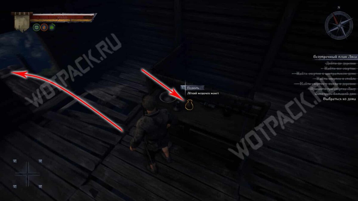 На столике справа захватите Легкий мешок монет и покиньте жилище, спрыгнув с балкона или крыши длинной пристройки.