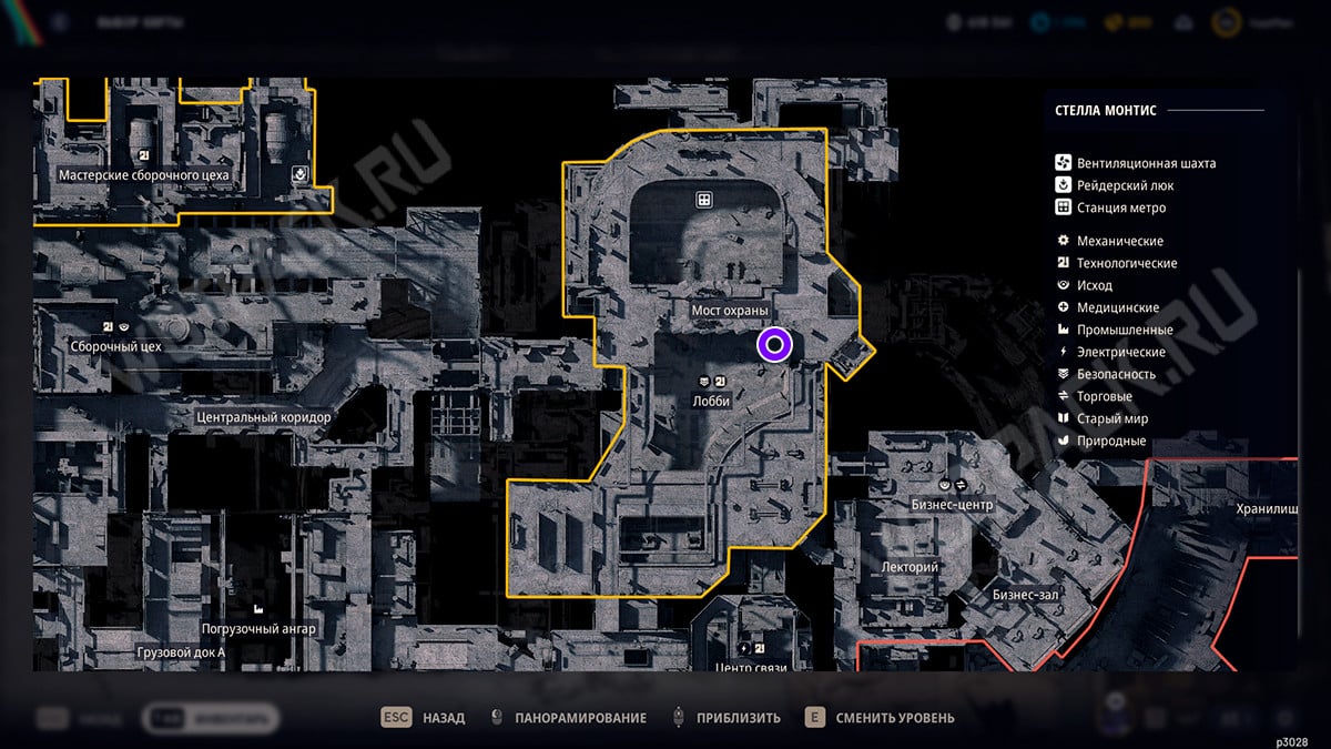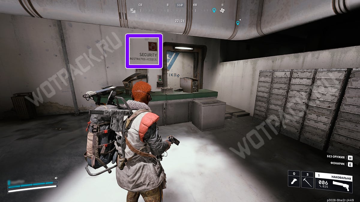 Комната находится на втором этаже верхнего уровня, в восточной части под мостом охраны. Дверь располагается в главном зале за зеленой стойкой: слева от входа увидите надпись «Security Restricted Access». Рядом может летать измельчитель — если наткнулись на него, забегите в помещение и заприте за собой дверь.