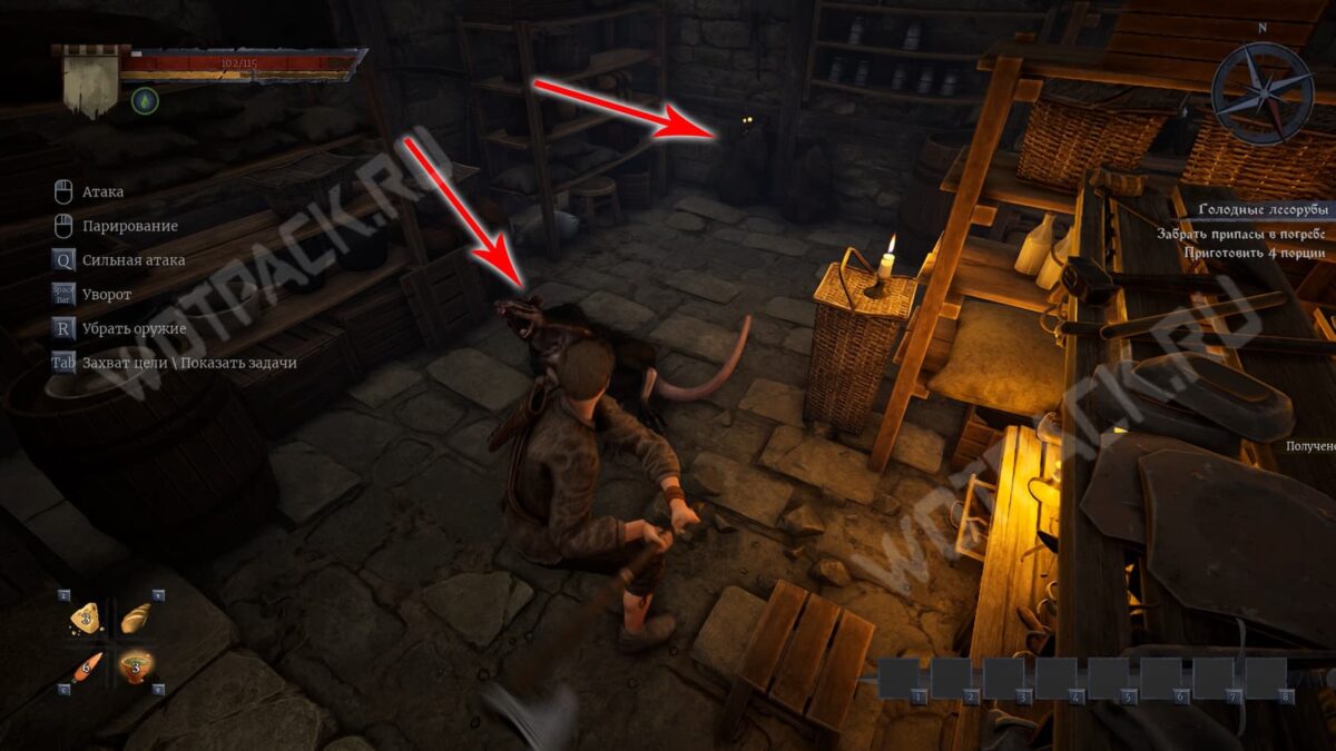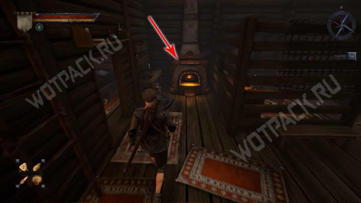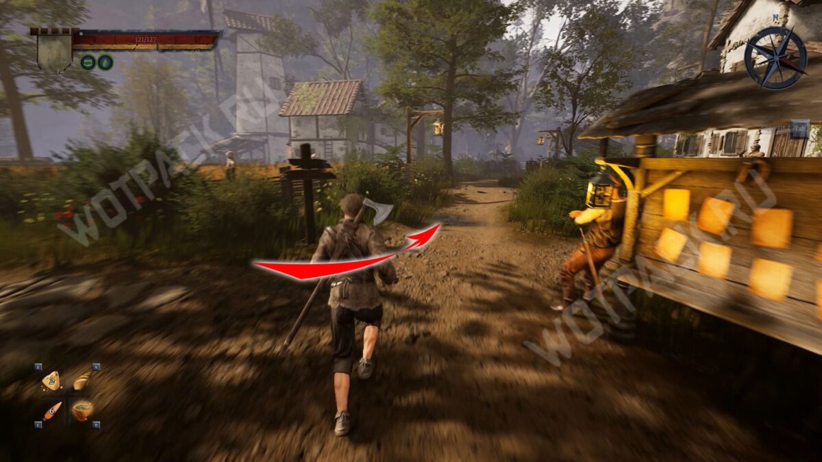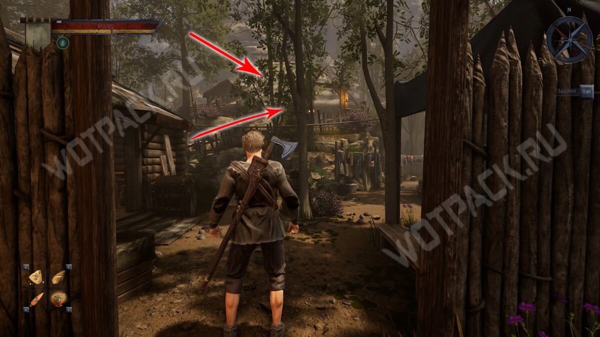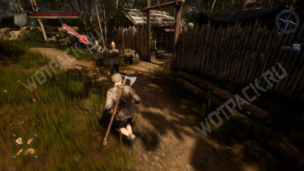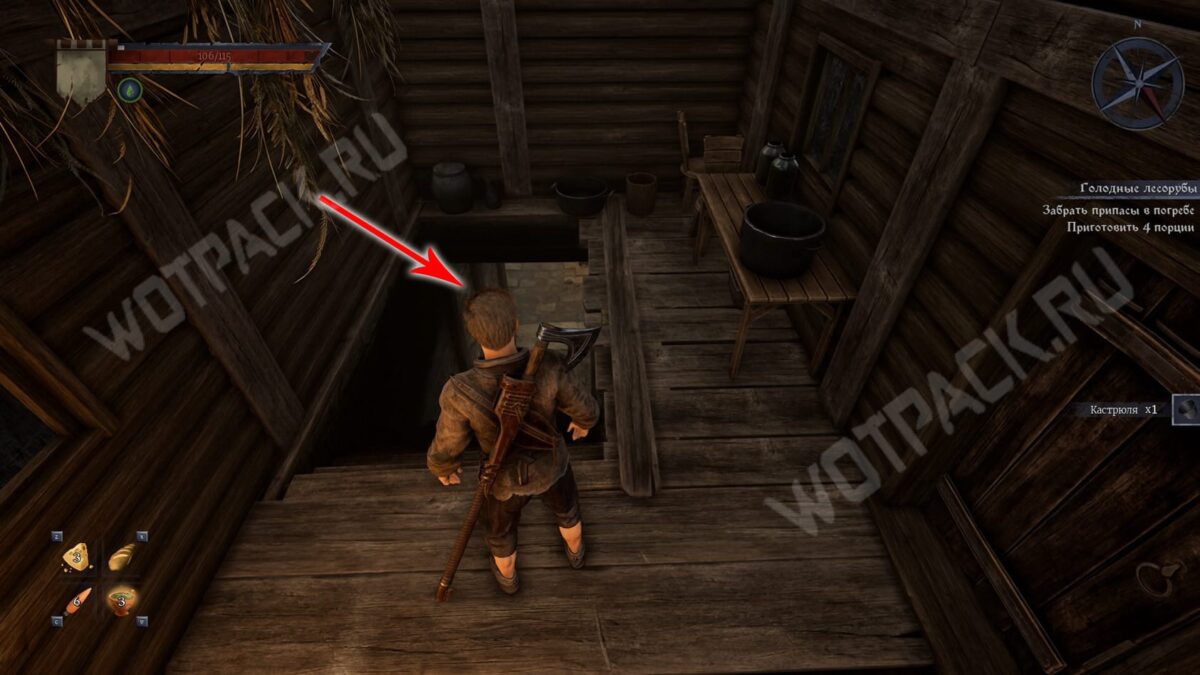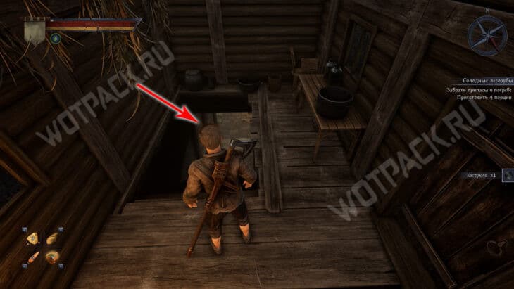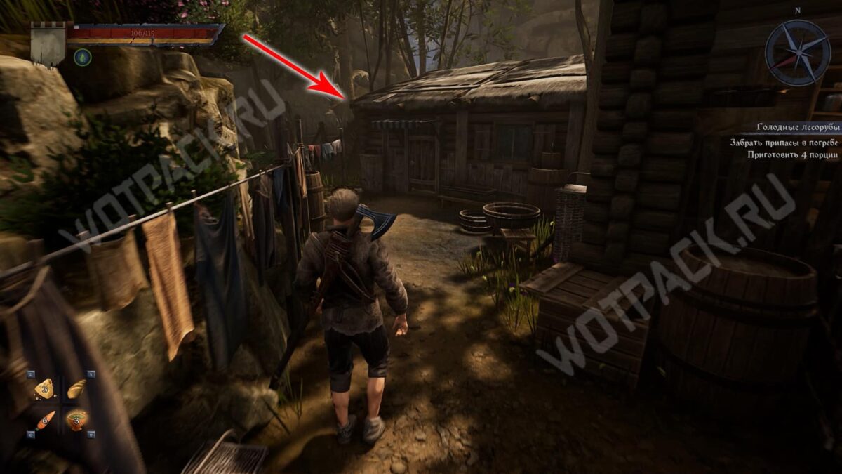 В разговоре с Акимом сможете взять ключ от кладовки, где лежат ингредиенты и рецепт блюда. Если в инвентаре хватает ресурсов, наварите побольше похлебки, чтобы получить дополнительные предметы от лесорубов, которые попросят добавки.