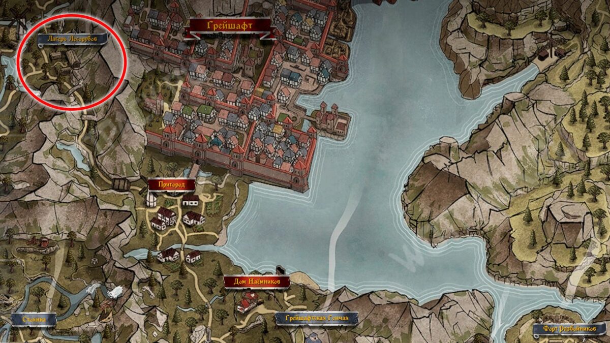 Поселение дровосеков находится на северо-западе от Пригорода, ближе к хижине Нереста и Заброшенной деревне. Из-за разрушенного моста на начальном этапе путь лежит через окрестности у стен Грейшафта.