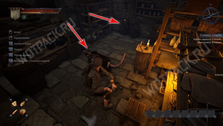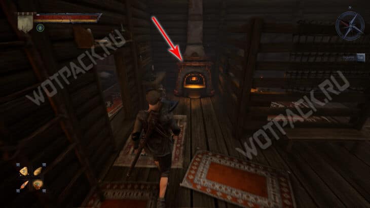 Войдите на территорию лагеря и поверните направо к небольшой лачуге около развешанных на сушке портков. Воспользуйтесь полученным ключом, чтобы отпереть дверь, и спуститесь в погреб.
