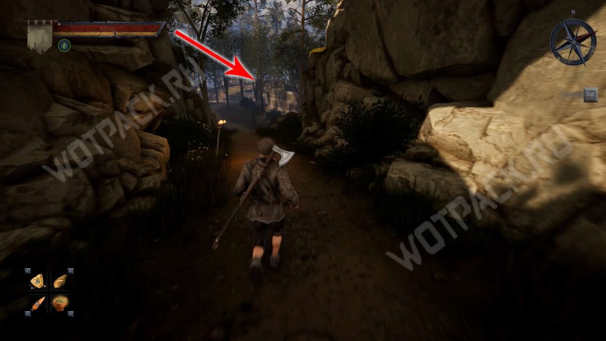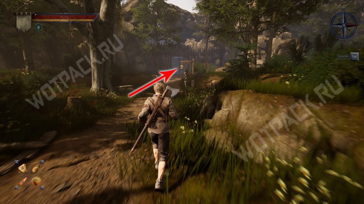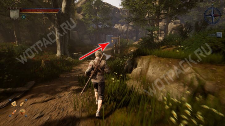 По прибытии в локацию следуйте по главной дороге мимо мельницы и сверните налево на развилке около указателя. Пройдите через проем в деревянном ограждении и двигайтесь по серпантину, не сворачивая с тропы.