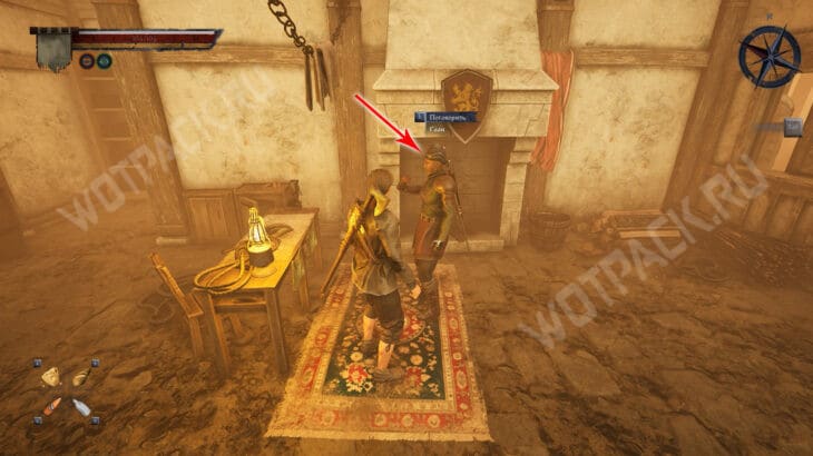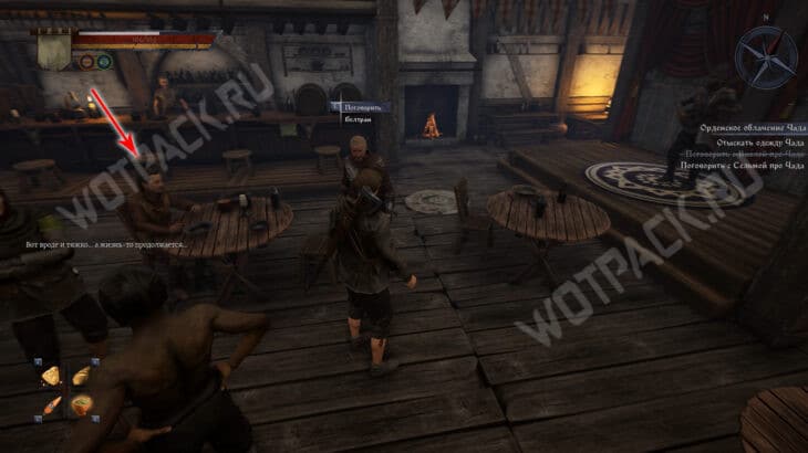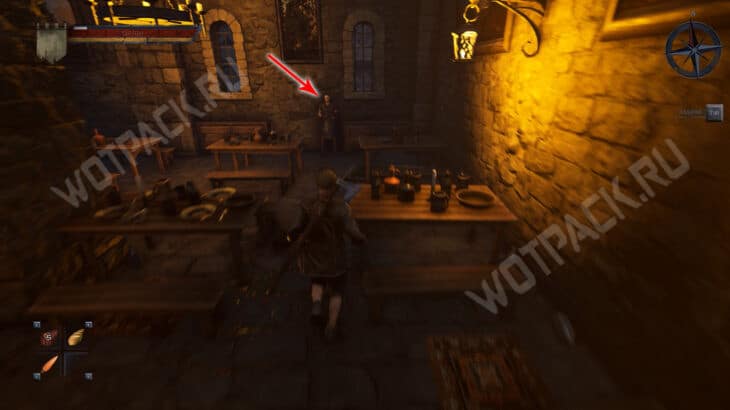 Приступить к этому этапу можно как в начале поручения, так и после нахождения клинка. Отправляйтесь в казармы Ордена и поднимитесь на второй этаж. В столовой у дальней стены будет стоять однорукий кузнец Пир.
