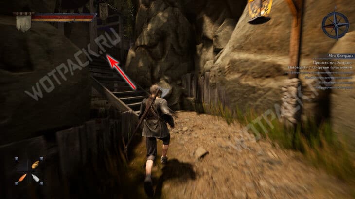Поднимитесь по небольшому горному переходу и затем спуститесь по деревянной лестнице. Бегите по протоптанной дорожке мимо разрушенных строений с телегами.