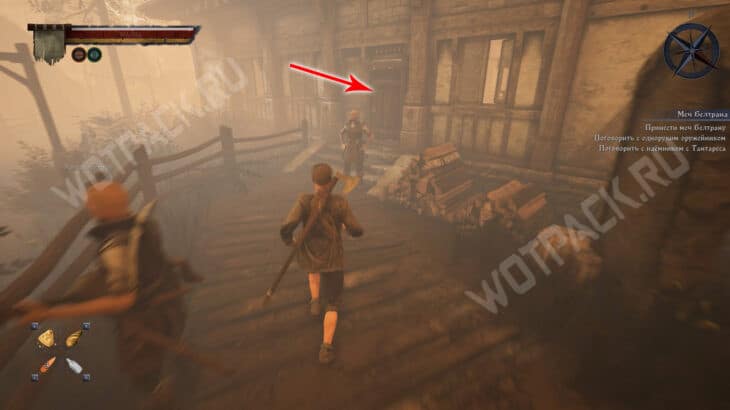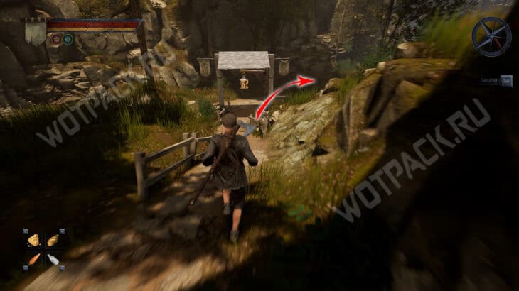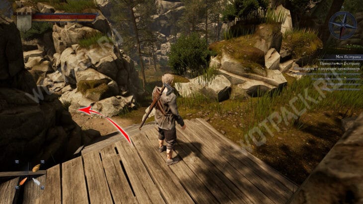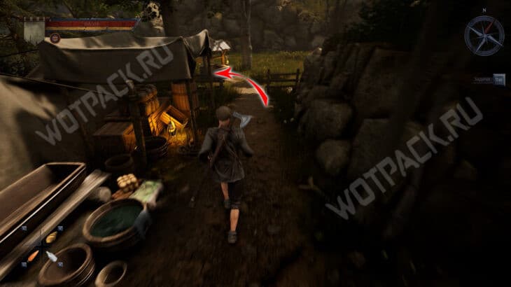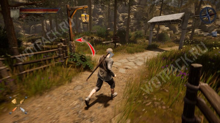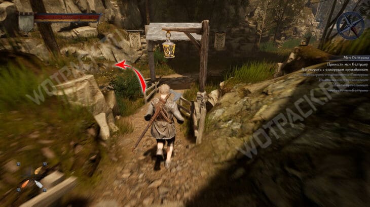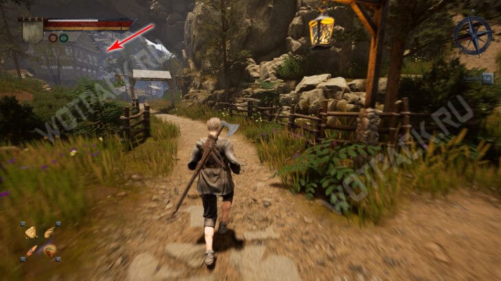 Покиньте таверну после диалога с Белтраном и следуйте по левой тропе. Наткнувшись на указатель, продолжайте движение вперед в сторону Рыбацкой деревни.