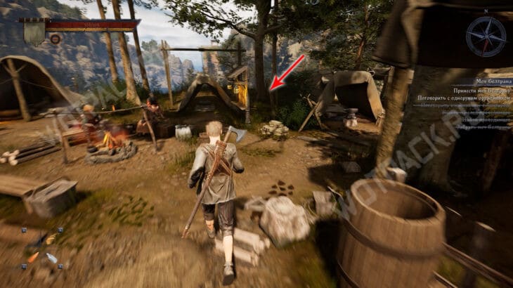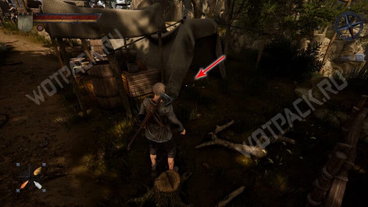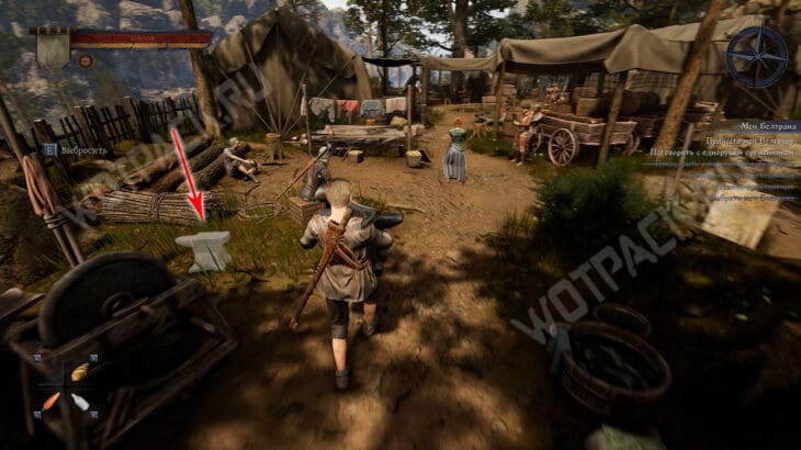 - Наковальня находится в кустах справа от палатки на возвышенности напротив развешанных на сушке вещей. Ее потребуется перетащить в обозначенное полупрозрачной формой место.