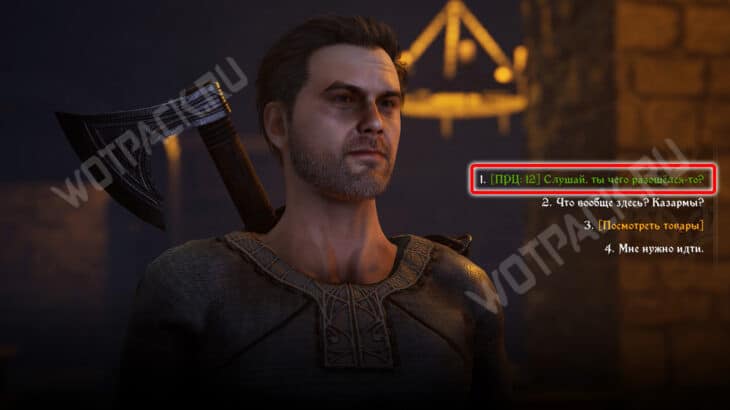 Попытайтесь узнать у мужчины о потерянном клинке — он сразу же прекратит разговор. Не покидайте локацию и еще раз побеседуйте с оружейником с помощью навыка Проницательность 12 — никаких дельных зацепок кузнец не выдаст, но в дальнейшем этот диалог поможет заполучить скрытое вознаграждение.