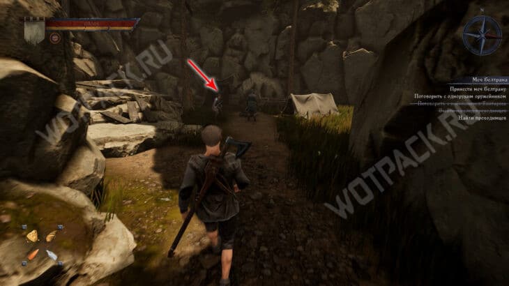 Пробегите через горный туннель и пройдите под скалистой аркой. Через пару шагов наткнетесь на привал проходимцев.