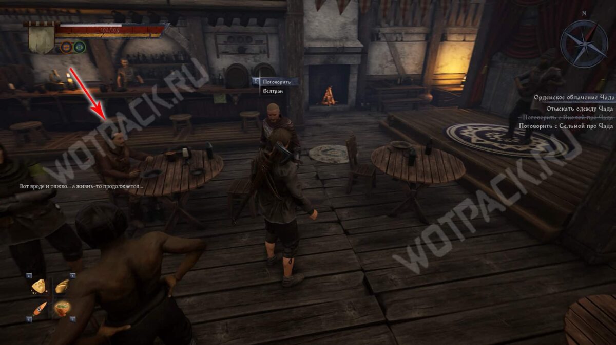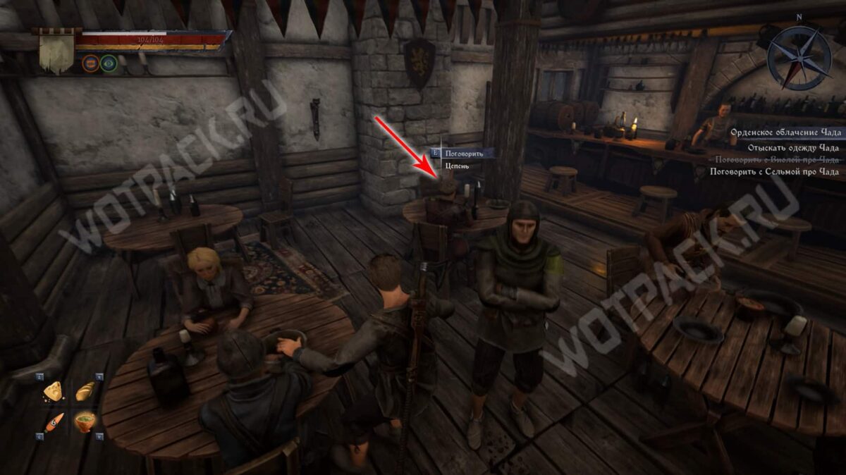 После разговора с Белтраном опросите Карла, сидящего за одним столом с воином. Он предложит узнать у кузнецов, сможет ли один из них повторить работу. Затем поговорите с торговцем Цепенем за столиком напротив. Он поделится наводкой за десять золотых и откроет в квестлоге последующие пункты.