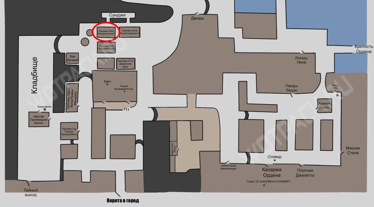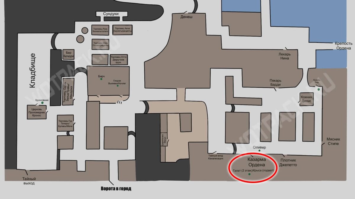 Взяв миссию Вступление в Орден Семи и поговорив с Габриэлем, отправляйтесь в Грейшафтскую Гончую на юго-востоке от Пригорода. Покиньте деревню через южный мост и доберитесь до статуи первопроходцам. На развилке сверните налево, затем через несколько шагов направо, не поднимаясь к Дому Наемников.