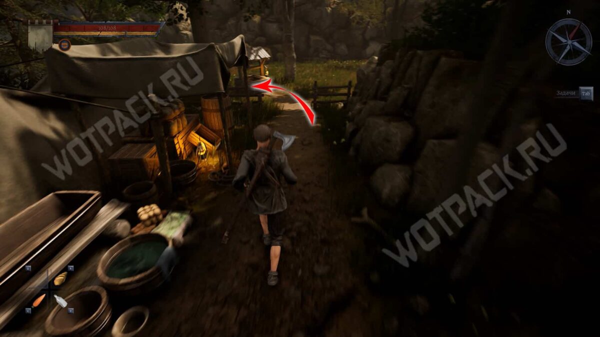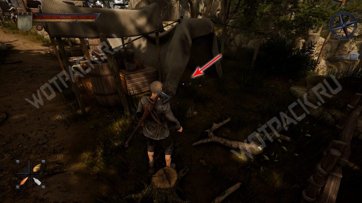 - Наковальня находится в кустах справа от палатки на возвышенности напротив развешанных на сушке вещей. Ее потребуется перетащить в обозначенное полупрозрачной формой место.