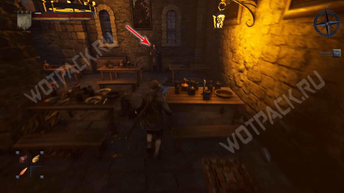 Приступить к этому этапу можно как в начале поручения, так и после нахождения клинка. Отправляйтесь в казармы Ордена и поднимитесь на второй этаж. В столовой у дальней стены будет стоять однорукий кузнец Пир.