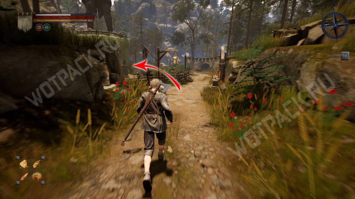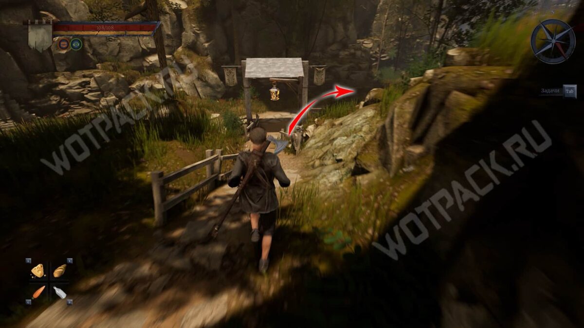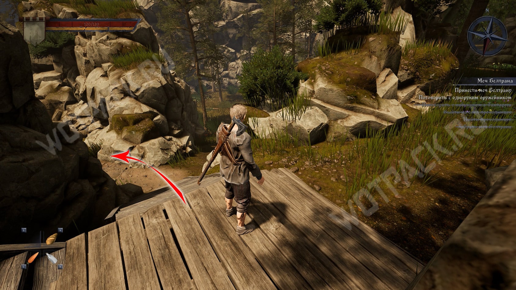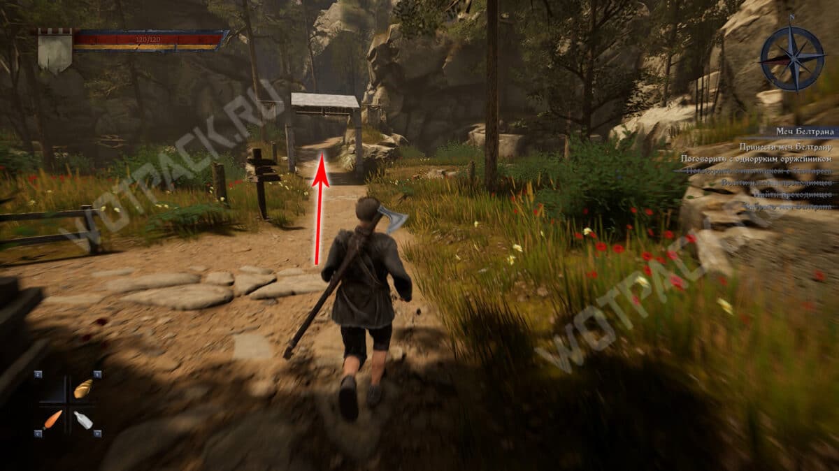 Покиньте таверну после диалога с Белтраном и следуйте по левой тропе. Наткнувшись на указатель, продолжайте движение вперед в сторону Рыбацкой деревни.