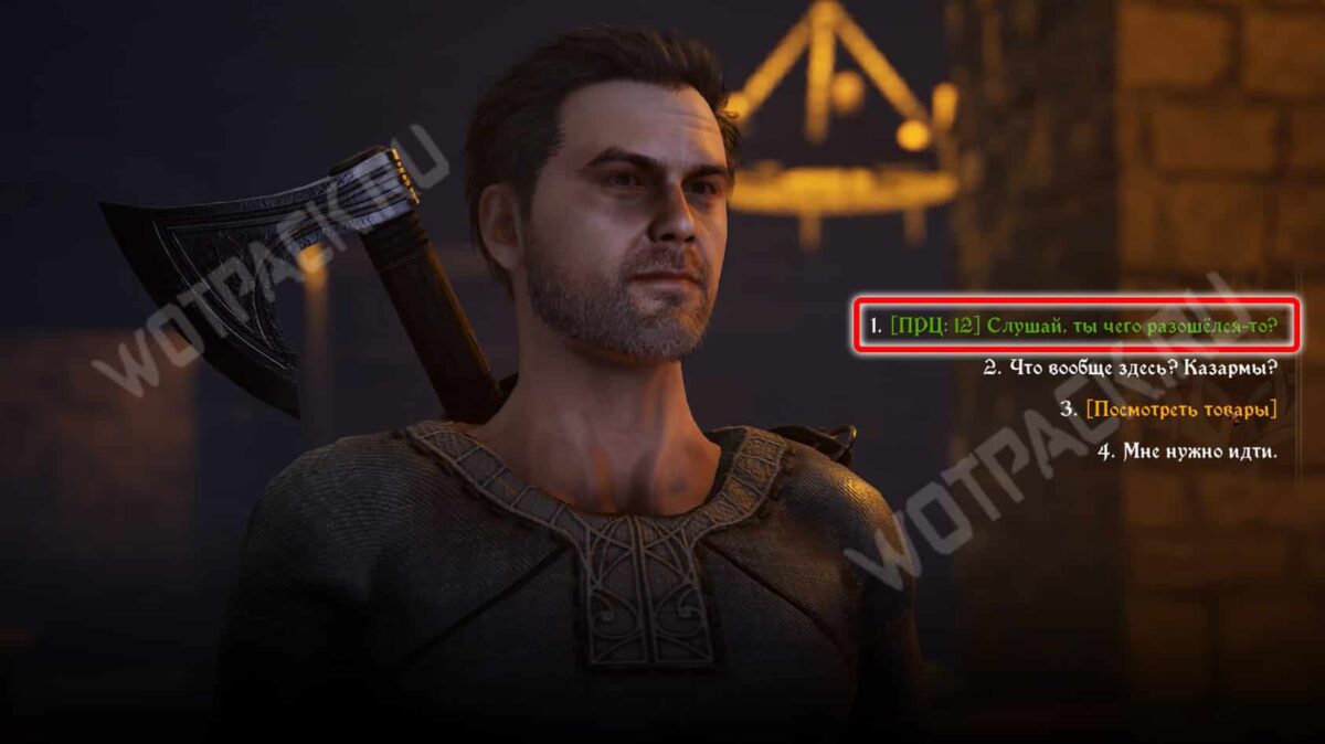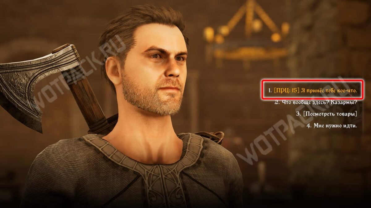 Попытайтесь узнать у мужчины о потерянном клинке — он сразу же прекратит разговор. Не покидайте локацию и еще раз побеседуйте с оружейником с помощью навыка Проницательность 12 — никаких дельных зацепок кузнец не выдаст, но в дальнейшем этот диалог поможет заполучить скрытое вознаграждение.
