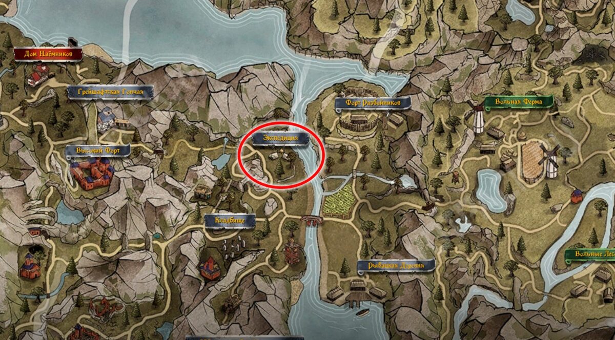 В Грейшафтской Гончей вновь обратитесь к Цепеню — теперь цена за его услуги будет 20 золотых. Он посоветует отправиться в лагерь разбойников неподалеку от Высокого Форта.