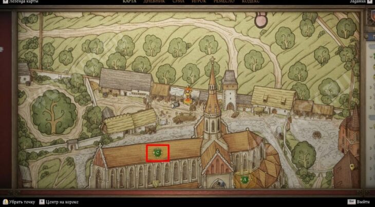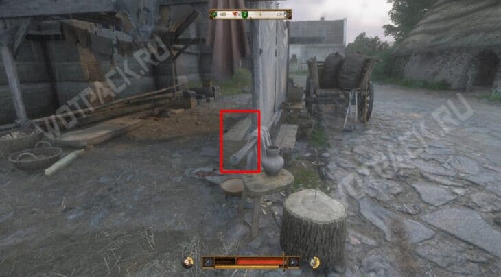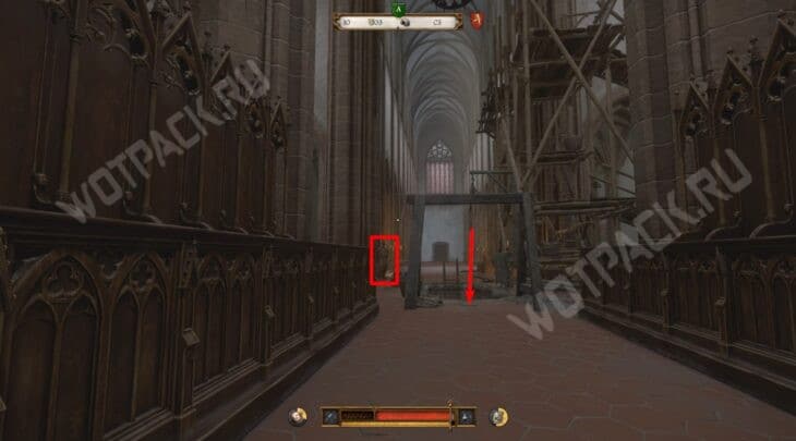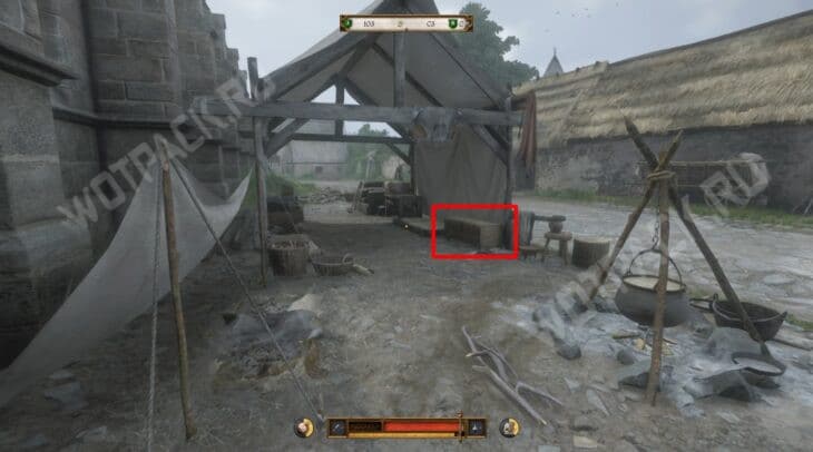 - Покиньте храм по строительным лесам и сверните налево. На севере от церкви найдете палатку, а внутри отыщете сундук. Забирайте всё содержимое.