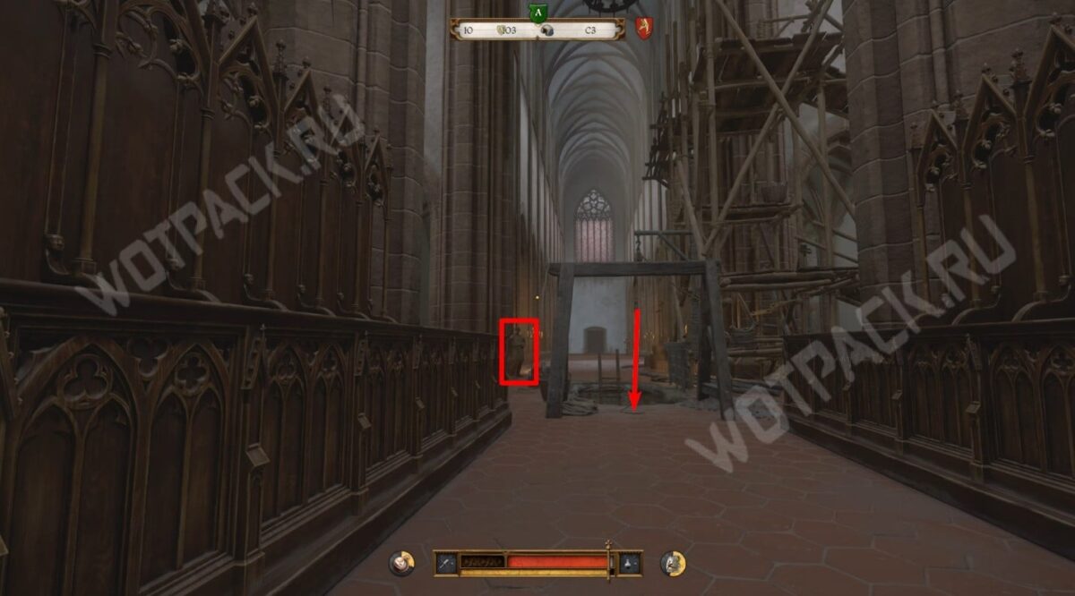 - Покиньте храм по строительным лесам и сверните налево. На севере от церкви найдете палатку, а внутри отыщете сундук. Забирайте всё содержимое.