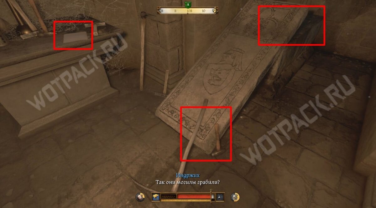 Двигайтесь по тоннелю к единственной закрытой комнате. Пройдите до конца помещения и обыщите крипту: сперва возьмите грязный пергамент со стола, затем осмотрите инструменты у крышки гроба. Напоследок изучите тело мертвеца: из-за расхитителей гробниц и начала распространяться зараза.