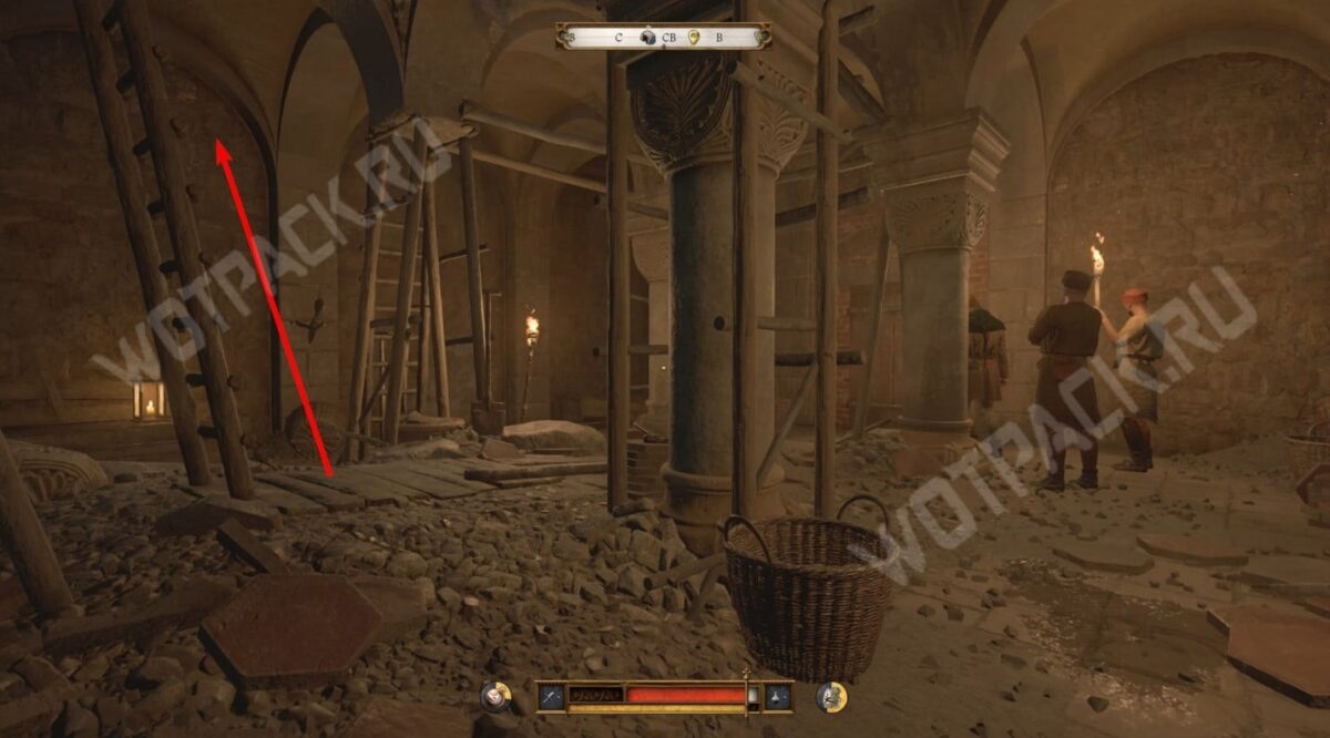 Вернувшись ко входу, сразу забирайтесь на лестницу, не привлекая внимания мужчин. Рабочего, который ранее стоял наверху, уже не будет.