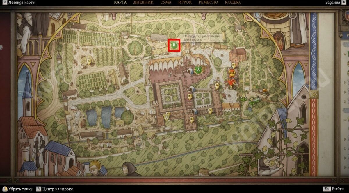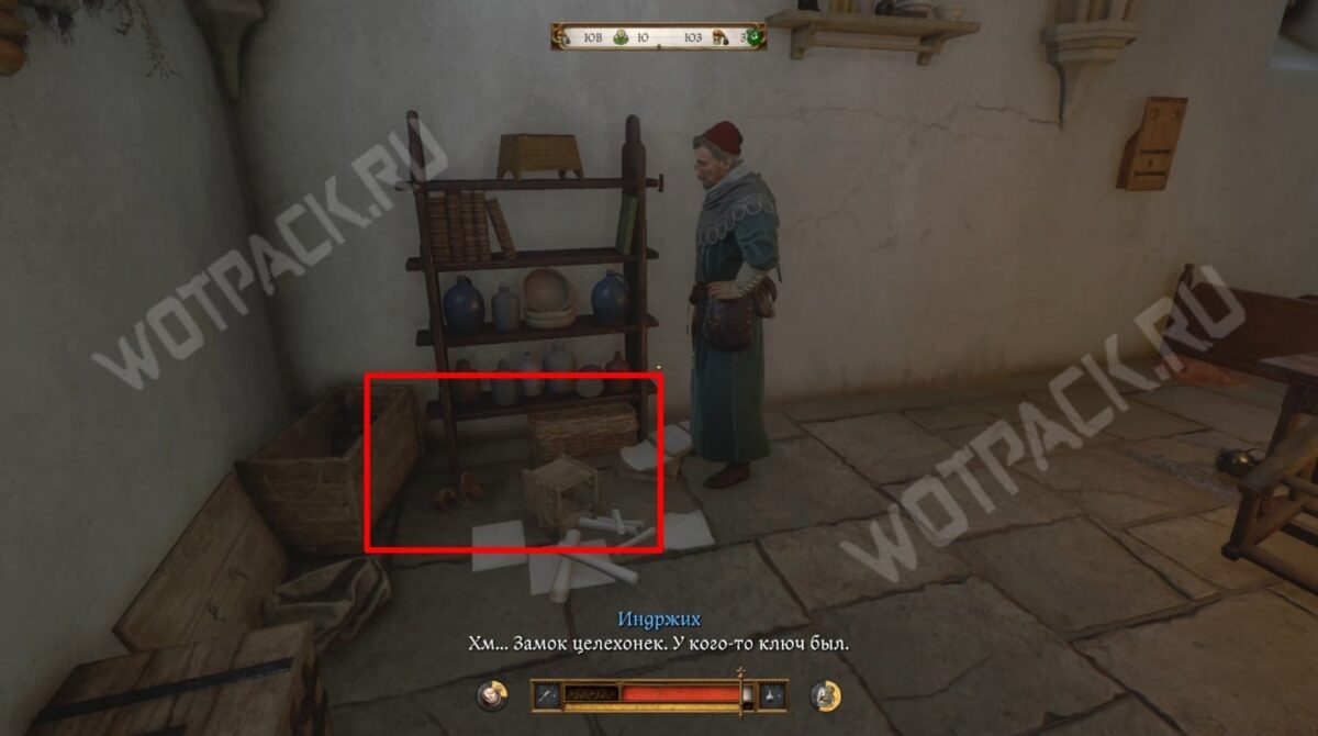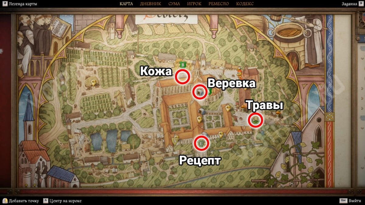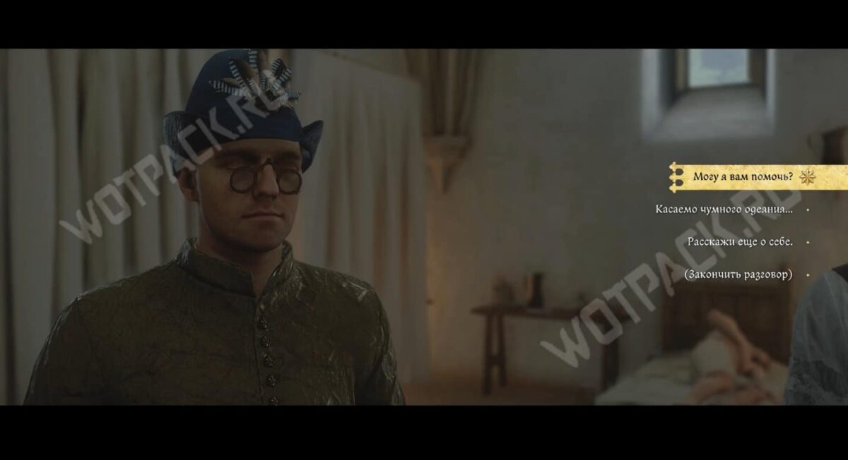 Сперва необходимо осмотреть разграбленную комнату: изучите дверной замок и разбросанные в углу вещи. Если не сделали капюшон перед походом в склеп, поговорите с лекарем и попросите снадобье от чумы.