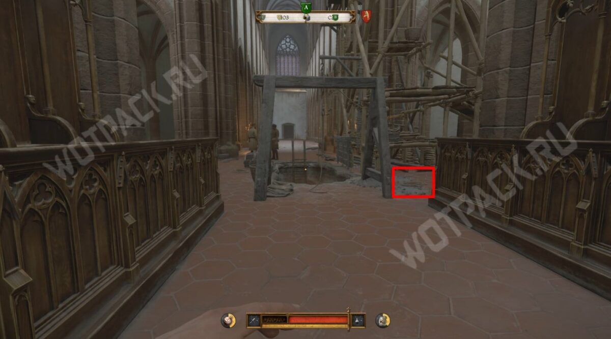 Вновь проникните в церковь через строительные леса и следуйте к её центру. Рядом с дырой, ведущей в склеп, стоит охранник, которого нужно отвлечь. Как только он отвернется, спрыгивайте вниз.