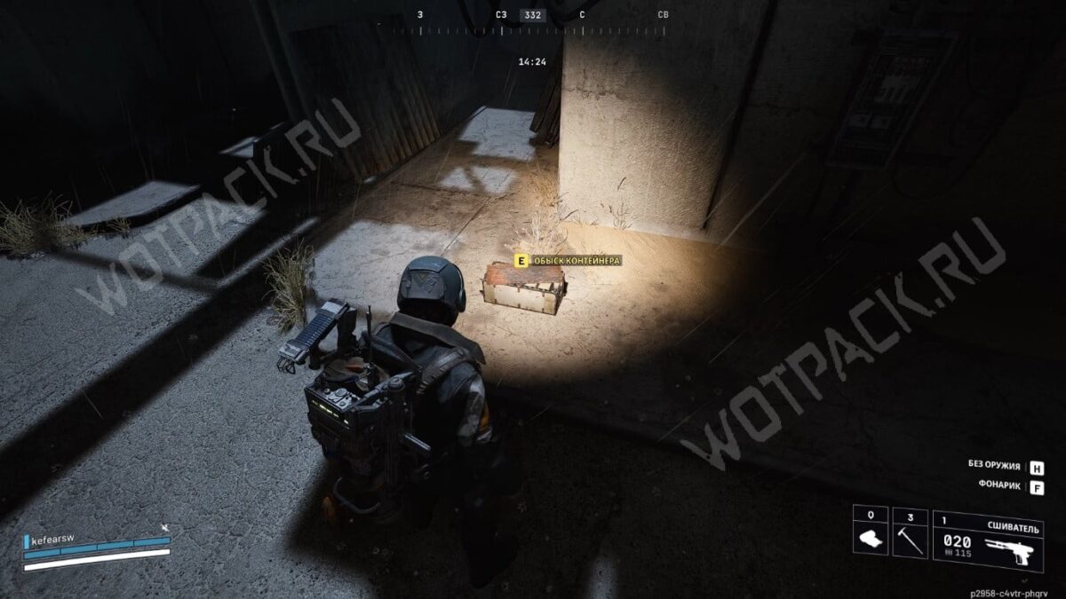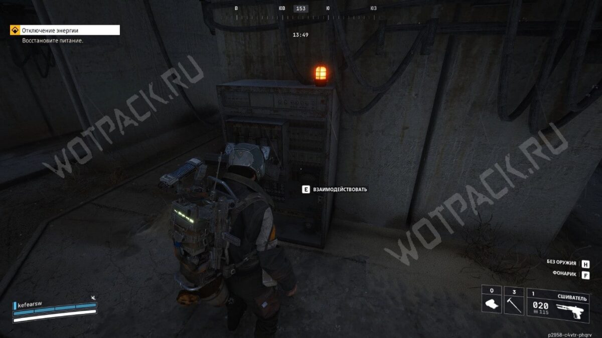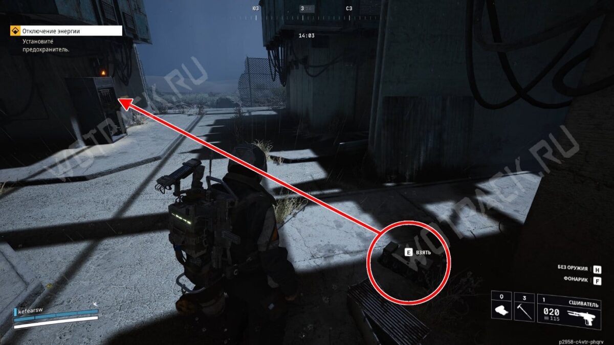 Обыщите контейнер — внутри лежит крупный элемент питания. Возьмите его в руки, нажав клавишу «E», и отнесите к открывшемуся неподалёку устройству. Установите предохранитель в ячейку, а затем поверните рычаг справа от неё.
