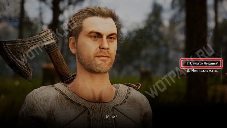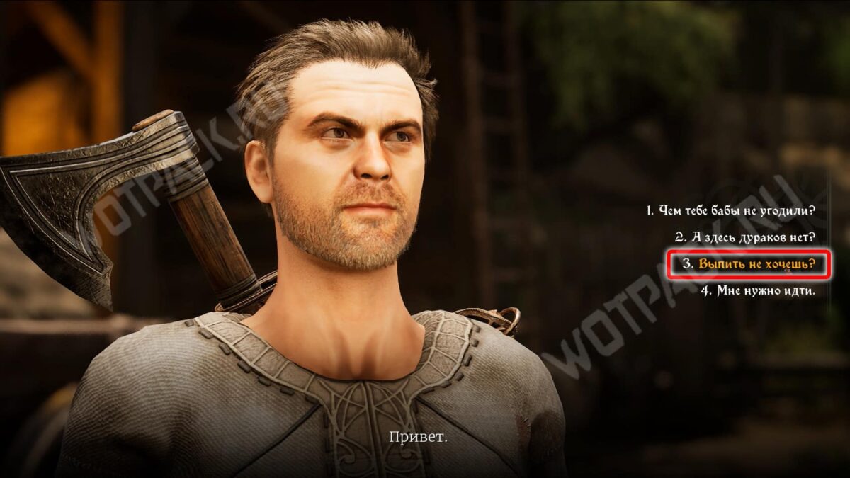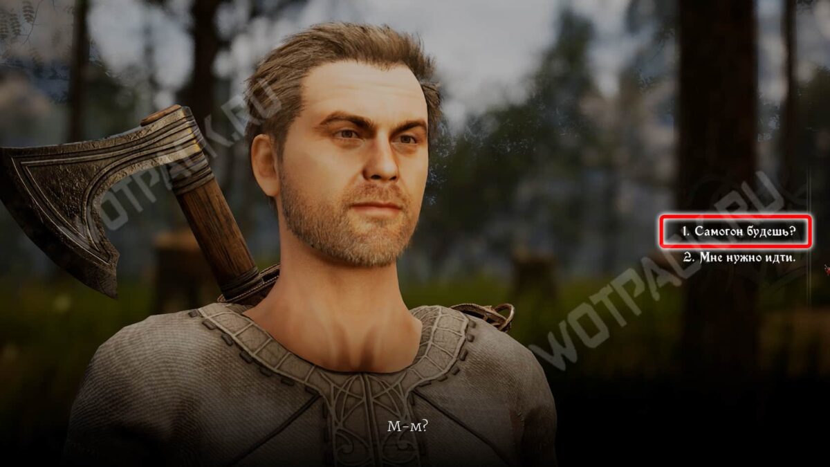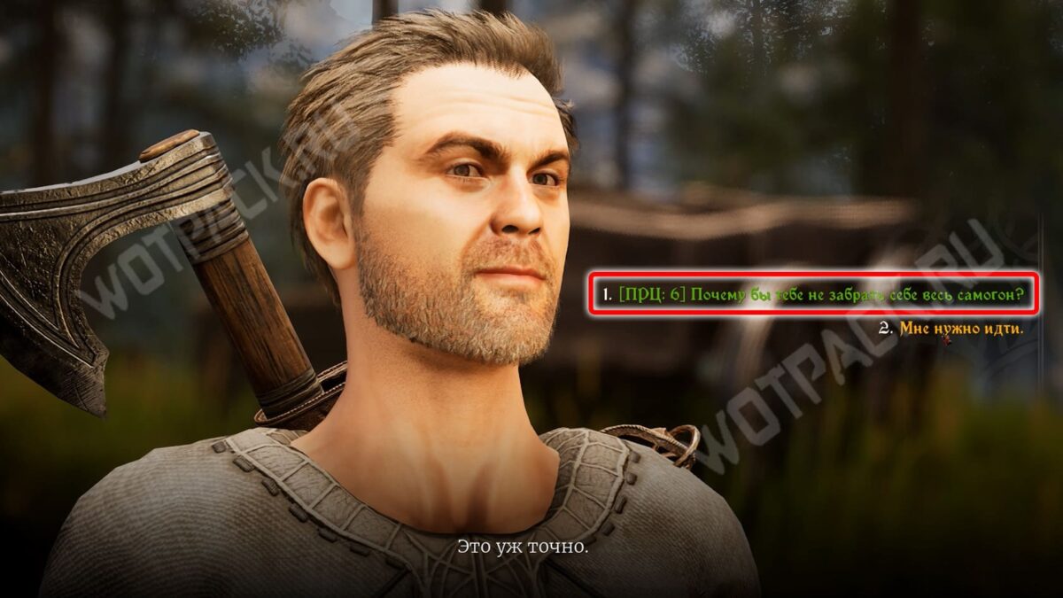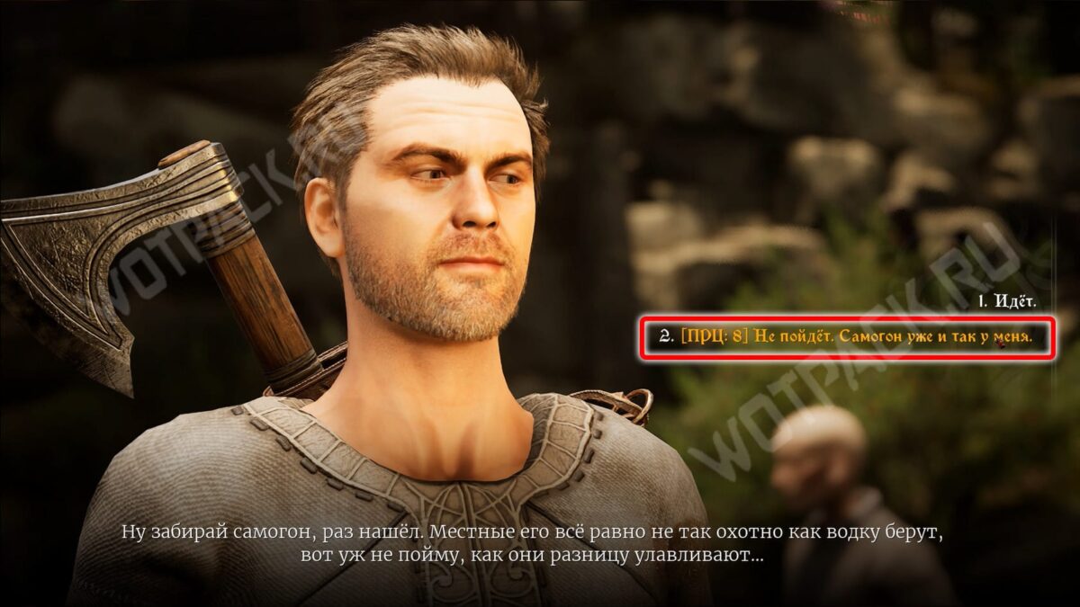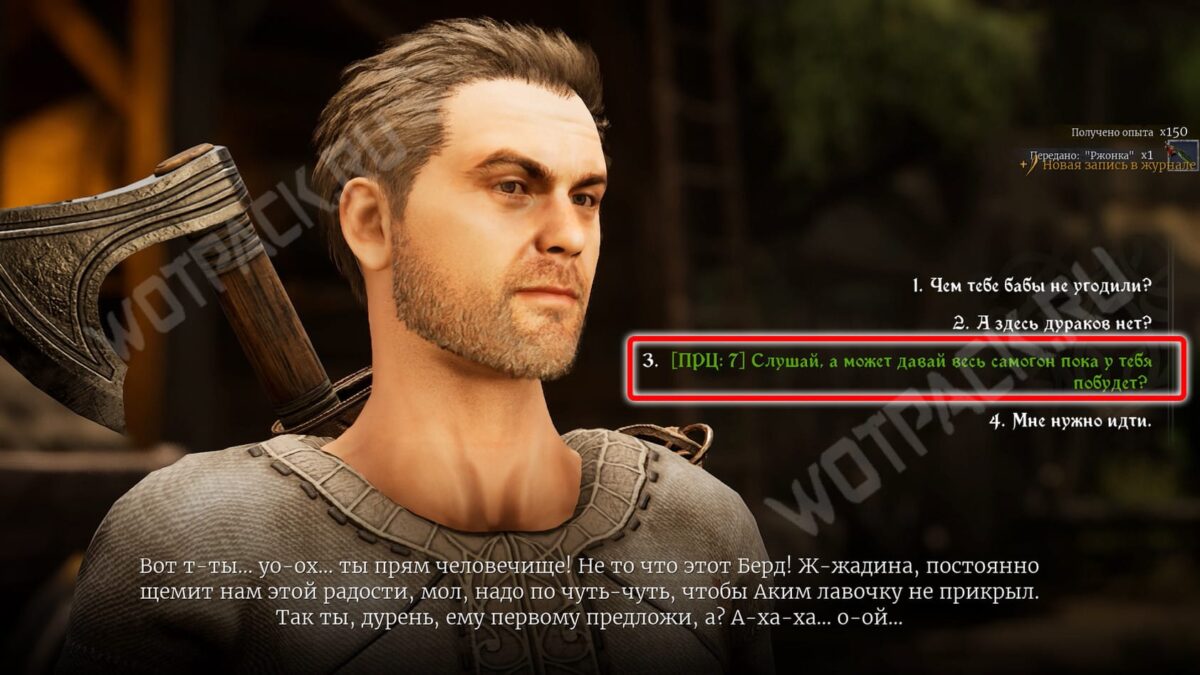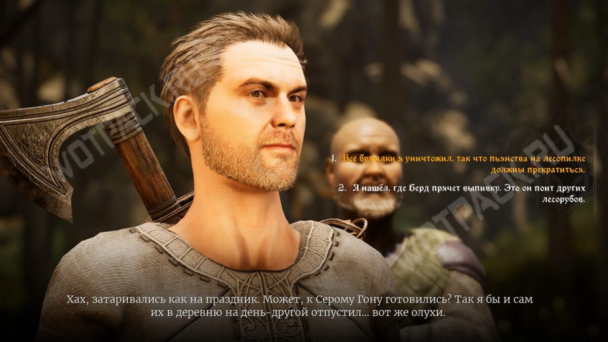 За угощение рабочий начислит дополнительный опыт. В этом случае не сможете взаимодействовать с Вимоном. Но удастся спрятать выпивку у лесоруба за Проницательность 6. Это ограничит выбор реплик у Акима — раскроете тайну дровосеков. Разговор с Бердом всё так же будет доступен, если не отдадите бутылки раньше.
