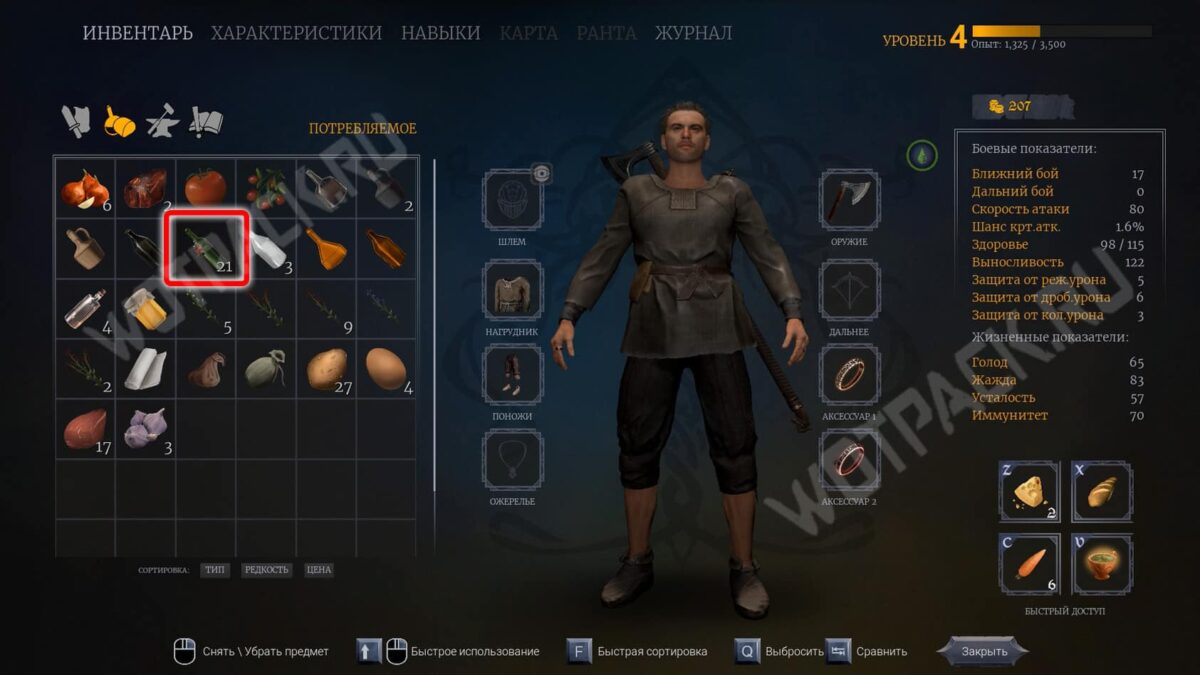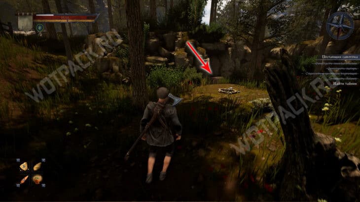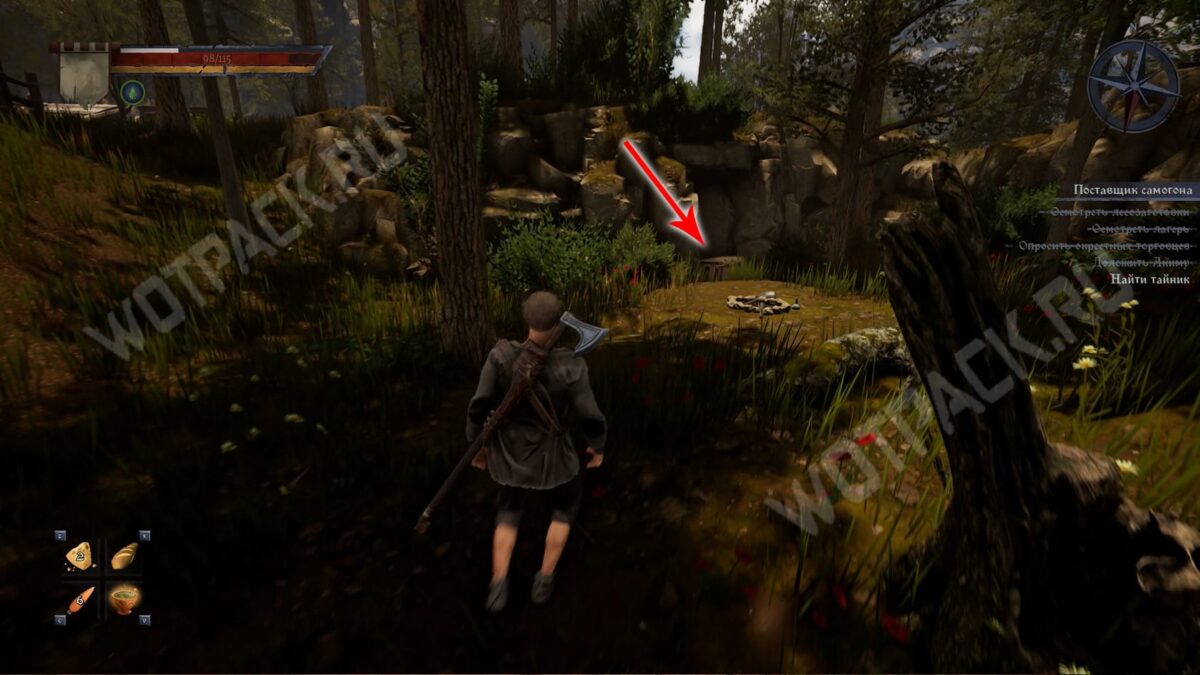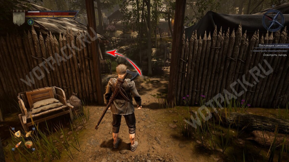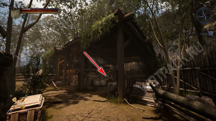От жилища рабочих идите по левой тропе и сверните в чащу около деревянного забора — напротив потушенного костра стоит сундук с бутылками «Ржонки».