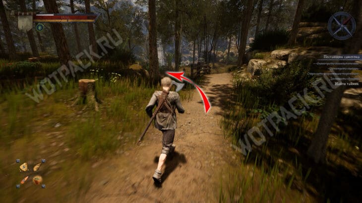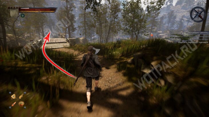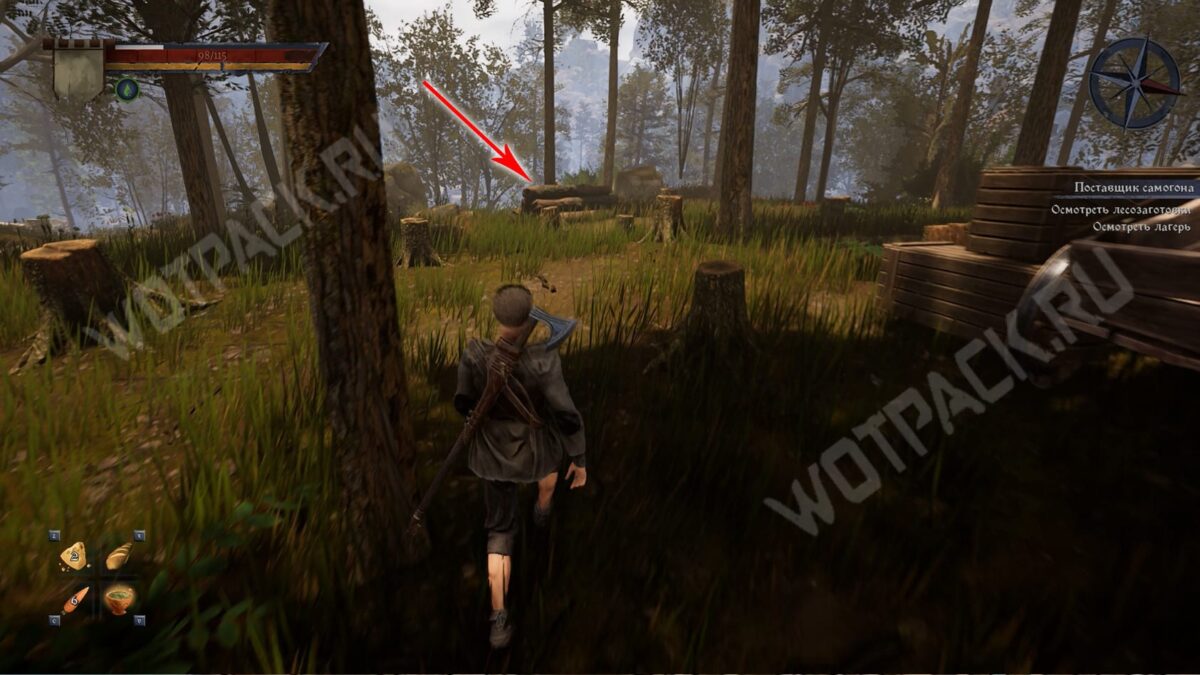 Поговорив с Акимом, отправляйтесь на поляну напротив лагеря и проверьте бревна, лежащие около дальней тропы. Когда подойдете к подсвеченной точке, пункт автоматически засчитается.