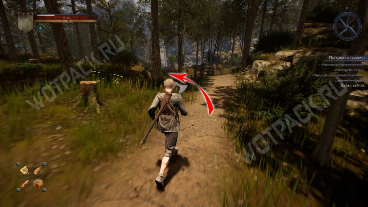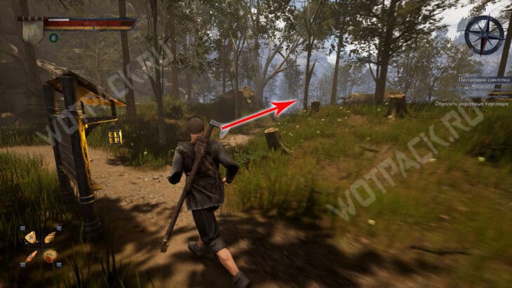 Предложите дровосеку выпить самогон — узнаете чей тайник в лесу и получите опыт. Затем отправляйтесь к Хуго и тоже угостите его Ржонкой — за это выдается дополнительный опыт.