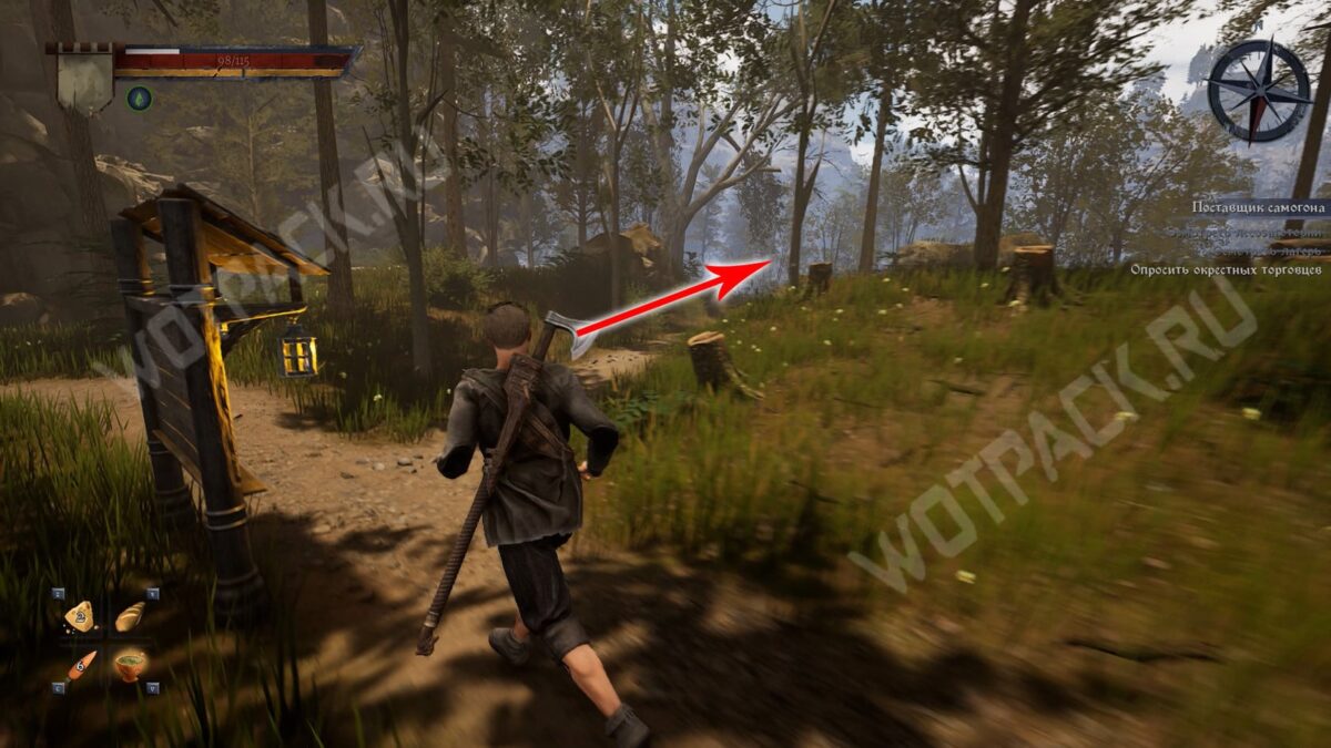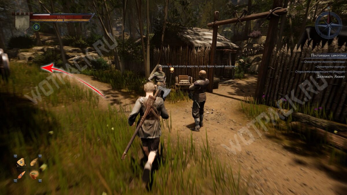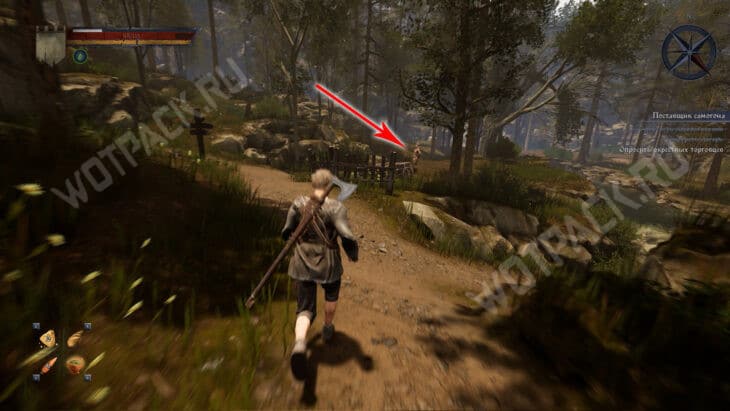 От нее следуйте по прямой, пока не наткнетесь на продавца рядом с телегой. В диалоге с ним можете выбрать любое из имен, так как он не вспомнит клиента и попросит прийти одного из лесорубов. После этого вернитесь к Акиму и доложите о произошедшем.