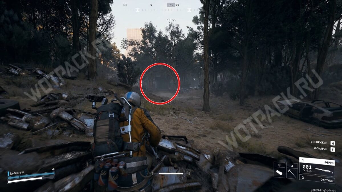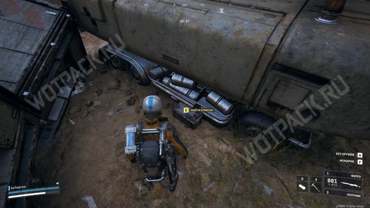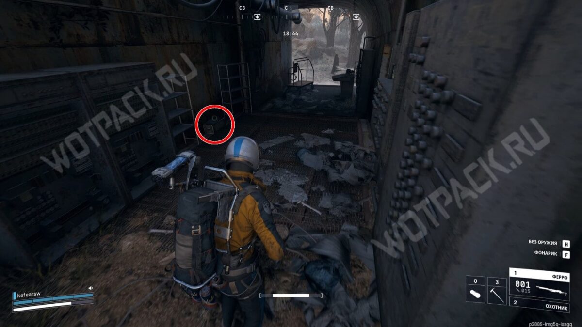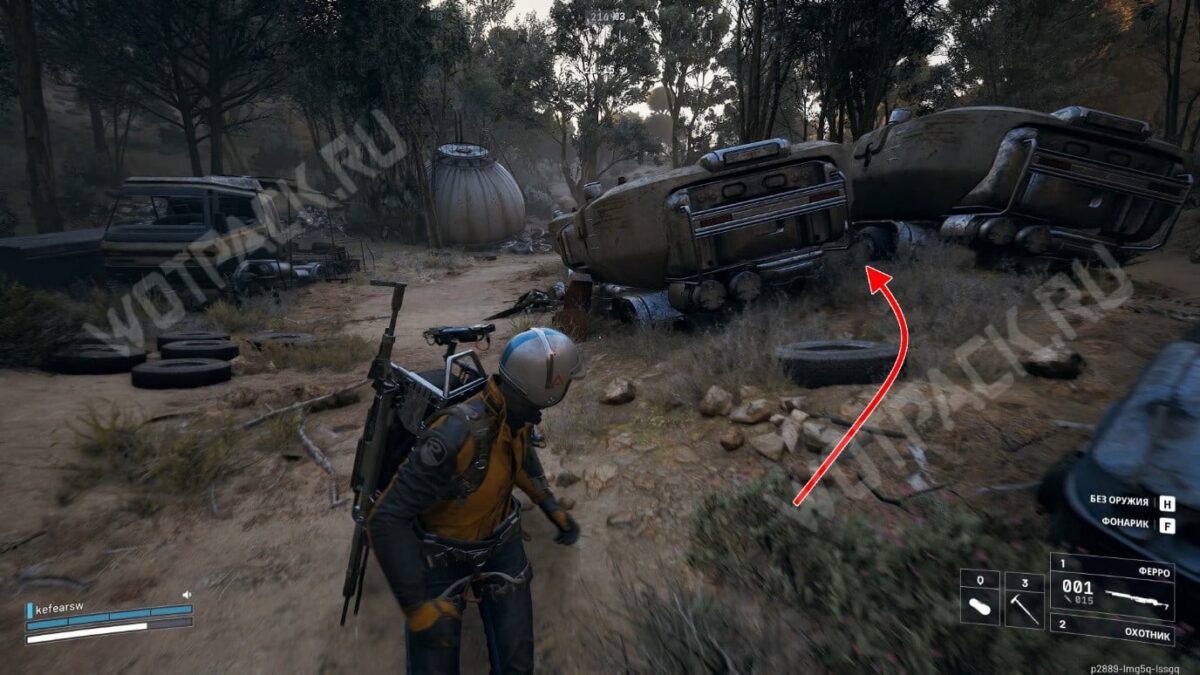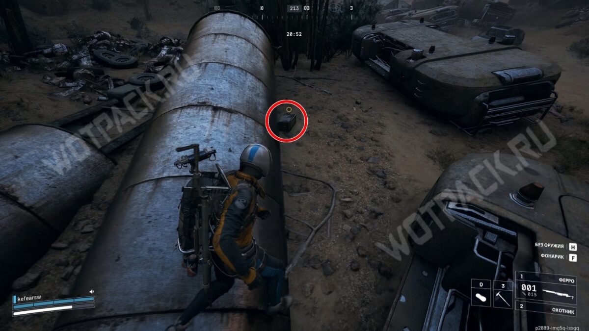 В этом случае нужны две цилиндрические цистерны, лежащие чуть восточнее грузовиков с компасом. Рядом с одной из них есть ящик, при взаимодействии с которым увидите надпись «Найти скотч» — это ошибка перевода. Порывшись в нём, вытащите искомую кассету времен Первой волны.