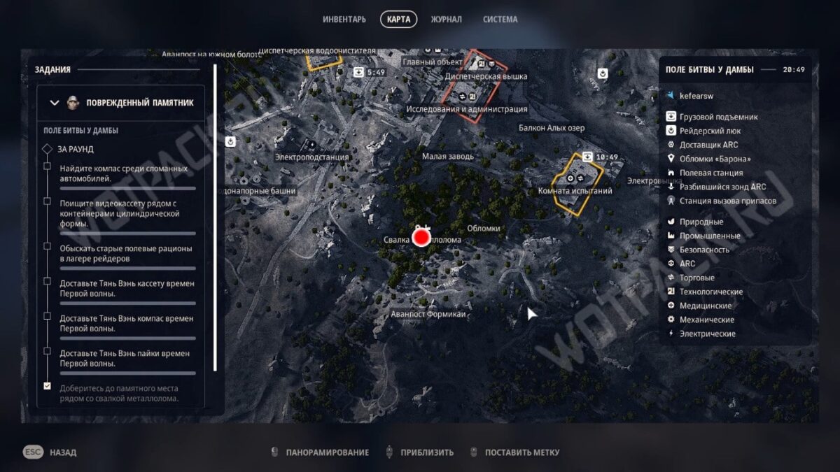 Цель задания — разыскать компас, видеокассету и полевые рационы в районе свалки металлолома. Она расположена в небольшом лесу в южной части карты. Прибыв на место, исследуйте три точки по описанию заказчицы, соберите памятные вещи в инвентарь и вынесите с рейда.