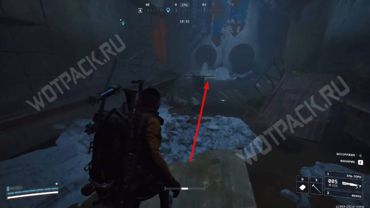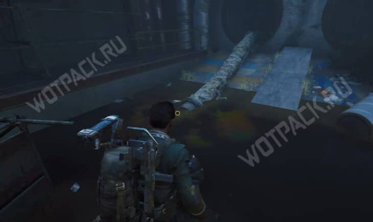 Пройдите вперед от стока, через который вошли. Перед железной решёткой, закрывающей водопровод, осмотрите ржавую воду и лежащий шланг. Около него находится триггер для взаимодействия, с помощью которого нужно взять пробу воды.