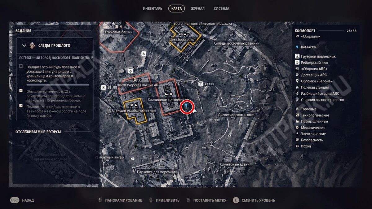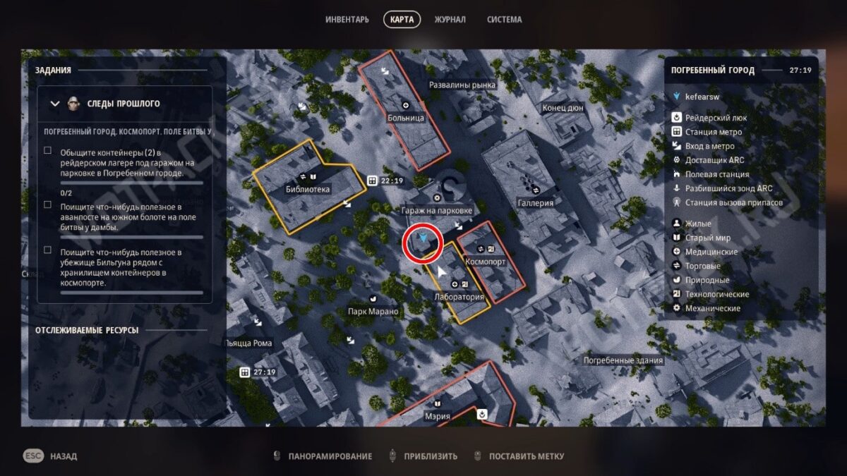 На парковке в Погребенном городе требуется обыскать два контейнера в убежище на нижнем уровне. Ищите здание на карте с соответствующей подписью — оно находится между больницей и «Космопортом». Это две зоны с высокой стоимостью добычи, поэтому поход к ним стоит тщательно продумать, чтобы не наткнуться на рейдеров.