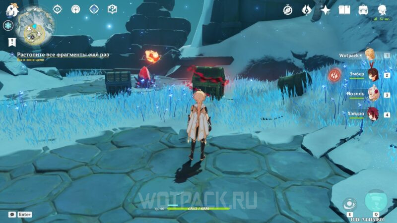 Когда все три теплых феи окажутся на своих местах, начните испытание в центре водоема. Во время него предстоит победить 4 волны Крио врагов за 3 минуты. Среди противников – хиличурлы, шамачурлы и Крио маги Бездны, поэтому возьмите в отряд Пиро персонажей и героев, способных создавать щиты.